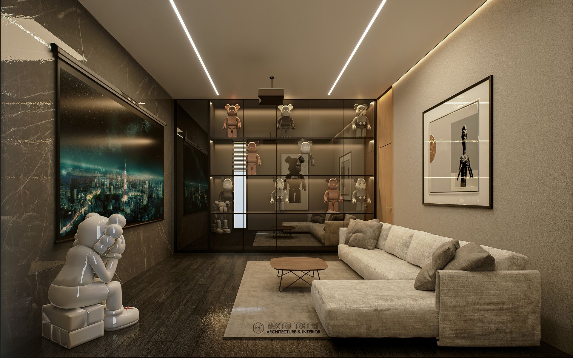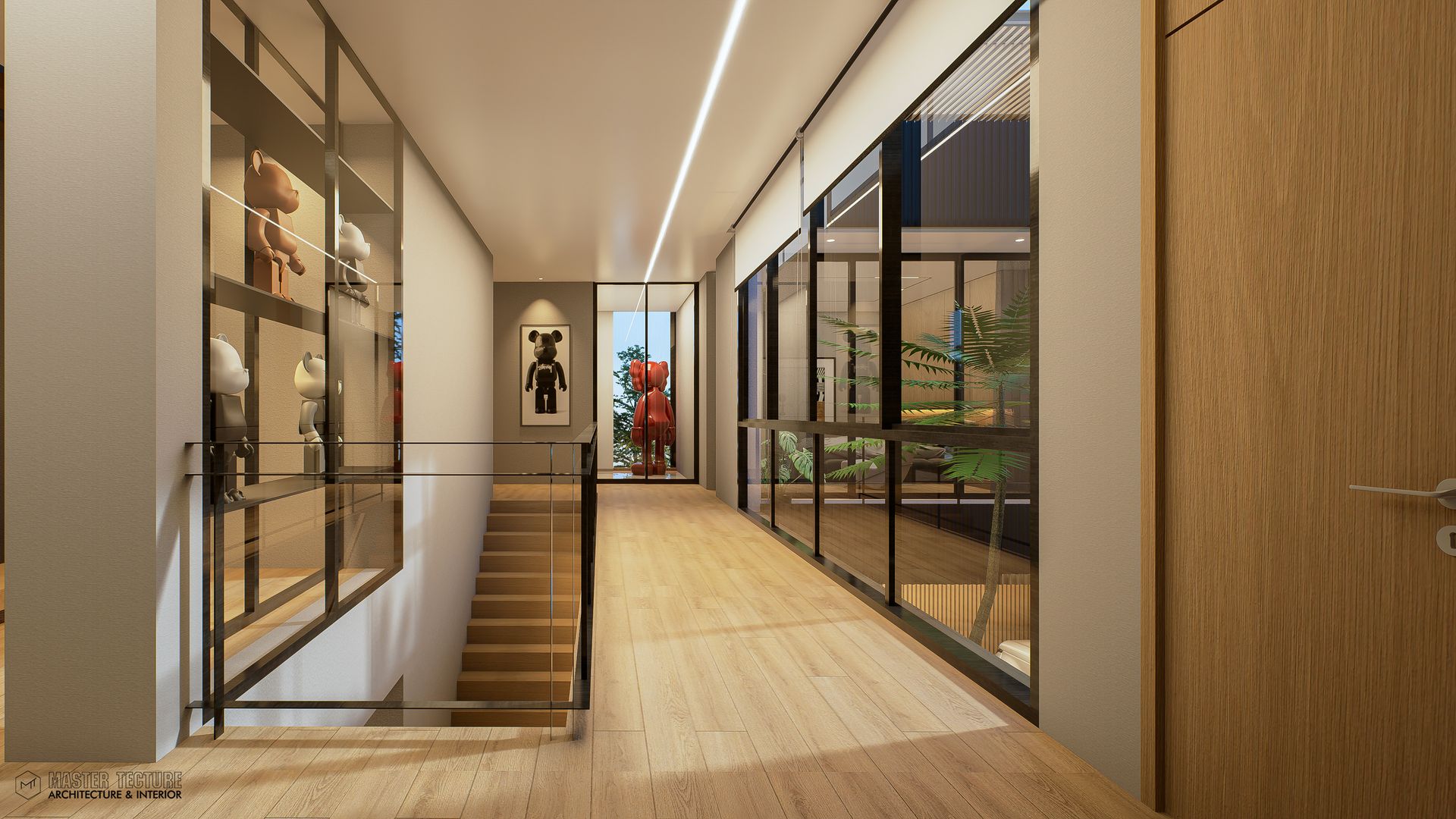 หลังนี้ประกอบไปด้วย 3 ชั้น โดยชั้นล่างสุด ใช้สำหรับเป็นส่วนกลาง และส่วนงานเซอร์วิสเป็นหลัก โดยส่วนกลางจะสามารถเชื่อมต่อกับเฉลียงขนาดใหญ่ยาวขนาบไปกับคอร์ทตรงกลาง พร้อมกับมีพื้นที่เปิด double space ที่จะเชื่อมต่อกับห้องนอนเล็กชั้น 2 ยังไม่เพียงเฉพาะพื้นที่นั้น แต่ห้องนอนใหญ่ ก็สามารถองเห็นพื้นที่ส่วนกลางได้เช่นกัน ระหว่างทางขึ้นบันได จะสังเกตเห็นว่าจะมีส่วนชั้นสำหรับ Art toy ซึ่งเป็นของสะสม เล็กๆน้อยๆของทาง Owner ชั้นบนสุดจะเป็นส่วนวำหรับห้องนอนแขก และห้อง entertain ที่เชื่อมต่อกับส่วนที่เป็นดาดฟ้าหน้าบ้าน ไว้สังสรรคปาร์ตี้ เรียกได้ว่า ทิ้งตัวบนพื้นที่ตรงนี้เลย