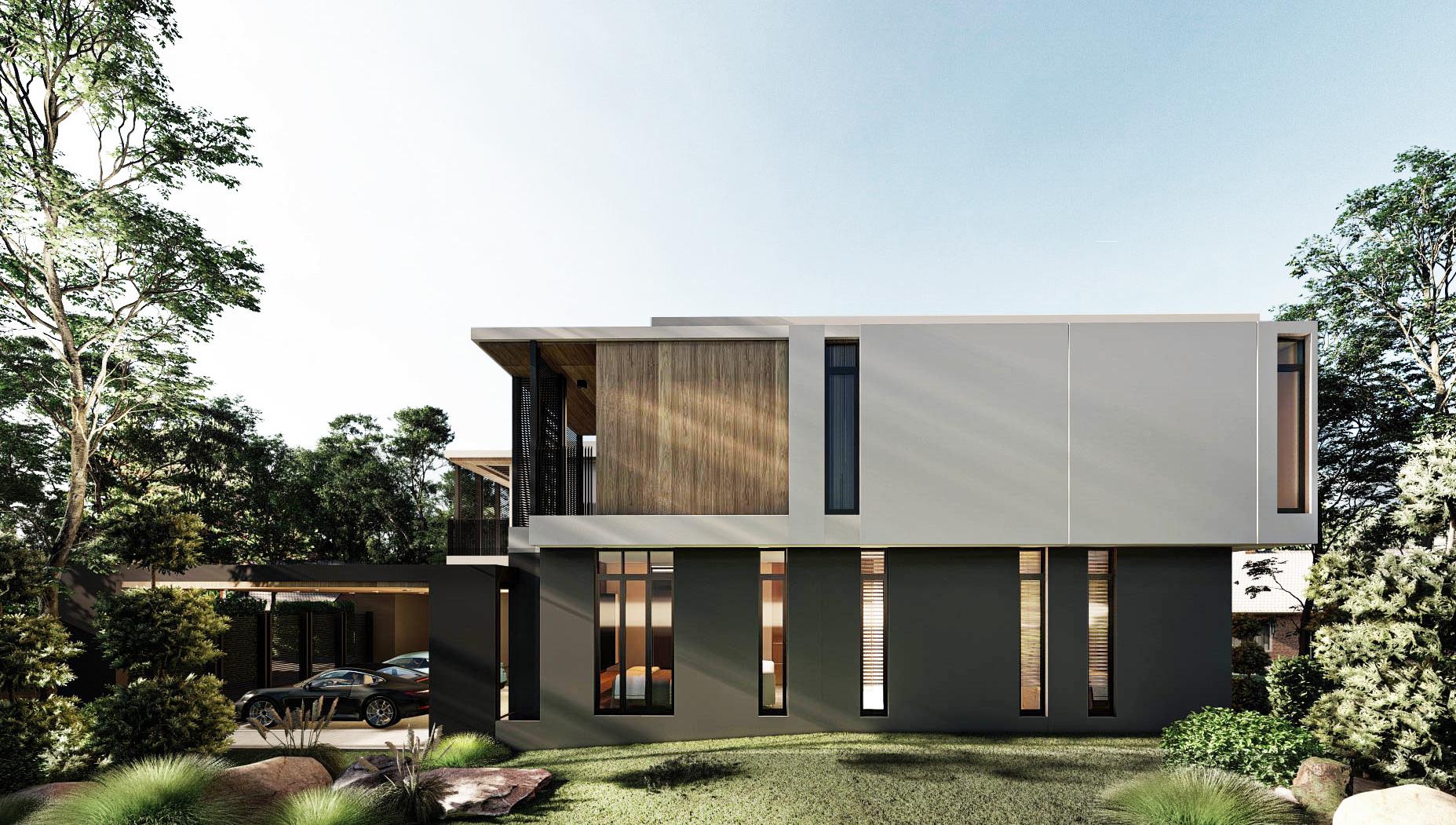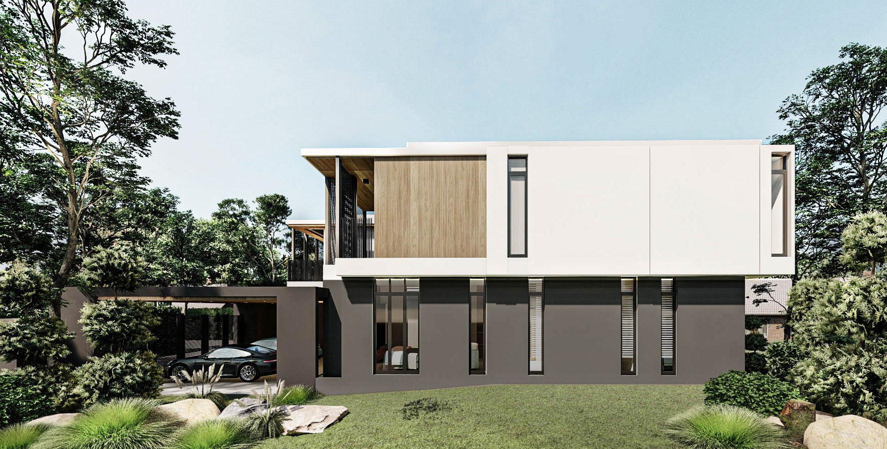 แนวความคิดการออกแบบ : บ้านหลังนี้ สถาปนิกได้รับโจทย์จากทางเจ้าของบ้านว่า ต้องการให้เป็นบ้านที่มีความเป็นส่วนตัวมากที่สุด ป้องกันการมองเห็นจากภายนอก แต่ส่วนภายในให้รู้สึกถึงความโปร่งโล่ง สว่าง สบายตามากในช่วงเวลากลางวันและอยู่โดยไม่ร้อน หรือไม่โดนแดดโดยตรง เมื่อทีมสถาปนิกให้ได้รับโจทย์จากทางเจ้าบ้าน จึงได้ทำการสำรวจ และวิเคราะห์องค์ประกอบต่างๆ โดยรอบ เช่น ทิศทางของอากาศ แดด ลม สิ่งแวดล้อมโดยรอบ ซึ่งส่วนที่ดินนั้นเป็นแปลงหัวมุม หน้าบ้านหันหน้าทางทิศใต้ และด้านข้างทิศตะวันตก ซึ่งเป็นทิศทางที่แดดค่อนข้างร้อน ทำให้การวางโซนนิ่งส่วนที่อยู่หน้าบ้าน จะเป็นห้องที่ใช้งานน้อยและเป็นห้องที่สมควรโดนแดด เช่น ห้องซักล้าง ห้องน้ำ เป็นต้น และประกอบกับที่ป้องกันความเป็นส่วนตัว จึงได้มีการออกแบบระแนง เพื่อป้องกันการมองเห็นและช่วยกรองแสง ความร้อนได้อีกด้วย สำหรับส่วนห้องที่ใช้อยู่ประจำจะอยู่ถัดไปทางทิศเหนือหรือหลังบ้าน จะเป็นทิศที่แดดเข้าถึงได้น้อย พร้อมทั้งยังมีสนามขนาดใหญ่หลังบ้าน บวกด้วยห้องนั่งเล่นเป็นพื้นที่ Double space ทั้งนี้ทั้งนั้นบ้านหลังนี้ยังออกแบบคอร์ทกลางบ้าน เพื่อเป็นจุดพักผ่อนของสมาชิกภายใน ที่แม้จะอยู่คนละห้องก็สามารถมองเห็นซึ่งกันและกันได้เสมอๆ