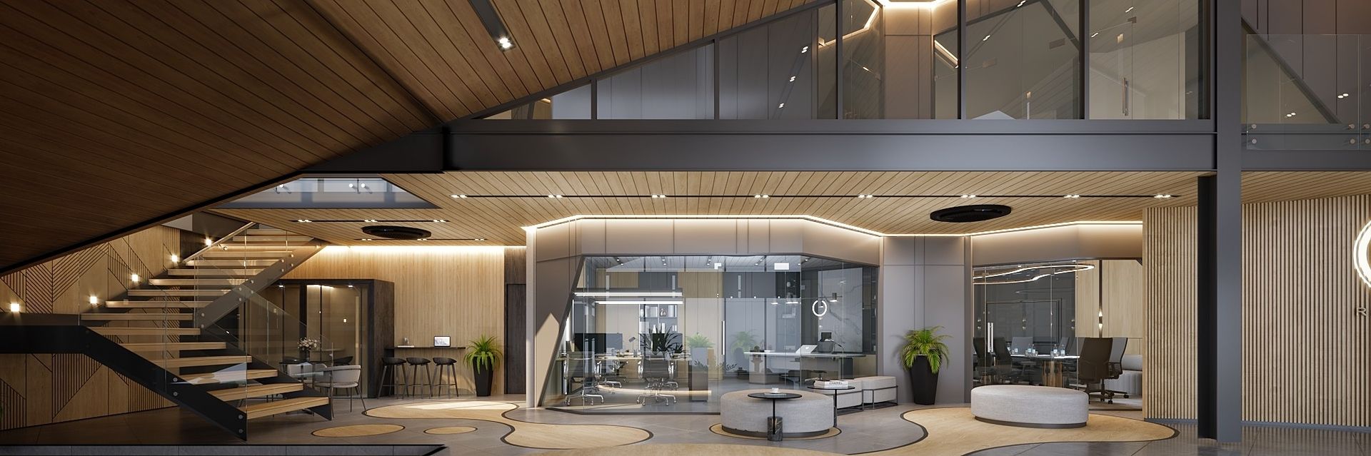 แนวความคิดการออกแบบ : สำหรับโครงการออฟฟิตนี้ มีโจทย์ทางลูกค้าให้ออกแบบออฟฟิต ที่อยู่ทางด้านหน้าโรงงานใหม่ที่กำลังก่อสร้าง ซึ่งเดิมแบบออฟฟิตมีอยู่แล้วมาพร้อมกับแบบโรงงานเป็นโครงสร้างเดียวกันอยู่แล้ว แต่ลูกค้าอยากให้รู้สึกว่าให้รู้สึกแบบทำงานในบรรยากาศของลักษณะเป็นโรงแรม หรือพื้นที่ที่ส่งผลให้รู้สึกสูงโปร่งมาก เพื่อเพิ่มบรรยากาศในการทำงาน และทำให้ลูกค้าที่เข้ามาติดต่องานกับทางโรงงานรู้สึกประทับใจ และมีความสุขกับการที่ได้ทำงานร่วมงานกับโรงงานที่มีความคิดแตกต่าง ไม่ใช่เป็นเหมือนลักษณะออฟฟิตโรงงานทั่วไปที่จะออกไปทางแนวๆ factory และทางลูกค้าสนใจรูป foam อาคารแบบสามเหลี่ยม ทางเราจึงได้วางรูปแบบของอาคาร โดยเป็นลักษณะของรูปทรงสามเหลี่ยมคว่ำ ทับซ้อนกัน 2 layer เพื่อให้ตัวอาคารโดดเด่นขึ้นมาแยกจากส่วนของโซนการผลิต และเปิดช่องกระจกทางด้านหน้าอาคารให้มากที่สุด เพื่อในตอนกลางวันในส่วนออฟฟิตมีแสงเพียงพอในการทำงาน โดยพื้นที่ชั้น 1 ในส่วนที่เป็นส่วนโถงต้อนรับ และห้องรับรองจะเป็นพื้นที่ double space โดยให้ฝ้า slope ตามแนวหลังคา เกิด ความสูงที่แตกต่างกัน ทำให้ความรู้สึกแตกต่างกันด้วย ในส่วนของชั้น 2 จะเป็นส่วนทำงาน และประชุม โดยเน้นผนังของแต่ละห้องเป็นกระจก เพื่อให้แต่ละห้องมีความรู้สึกที่เชื่อมต่อกัน และมองเห็นการทำงานกันตลอดเวลา