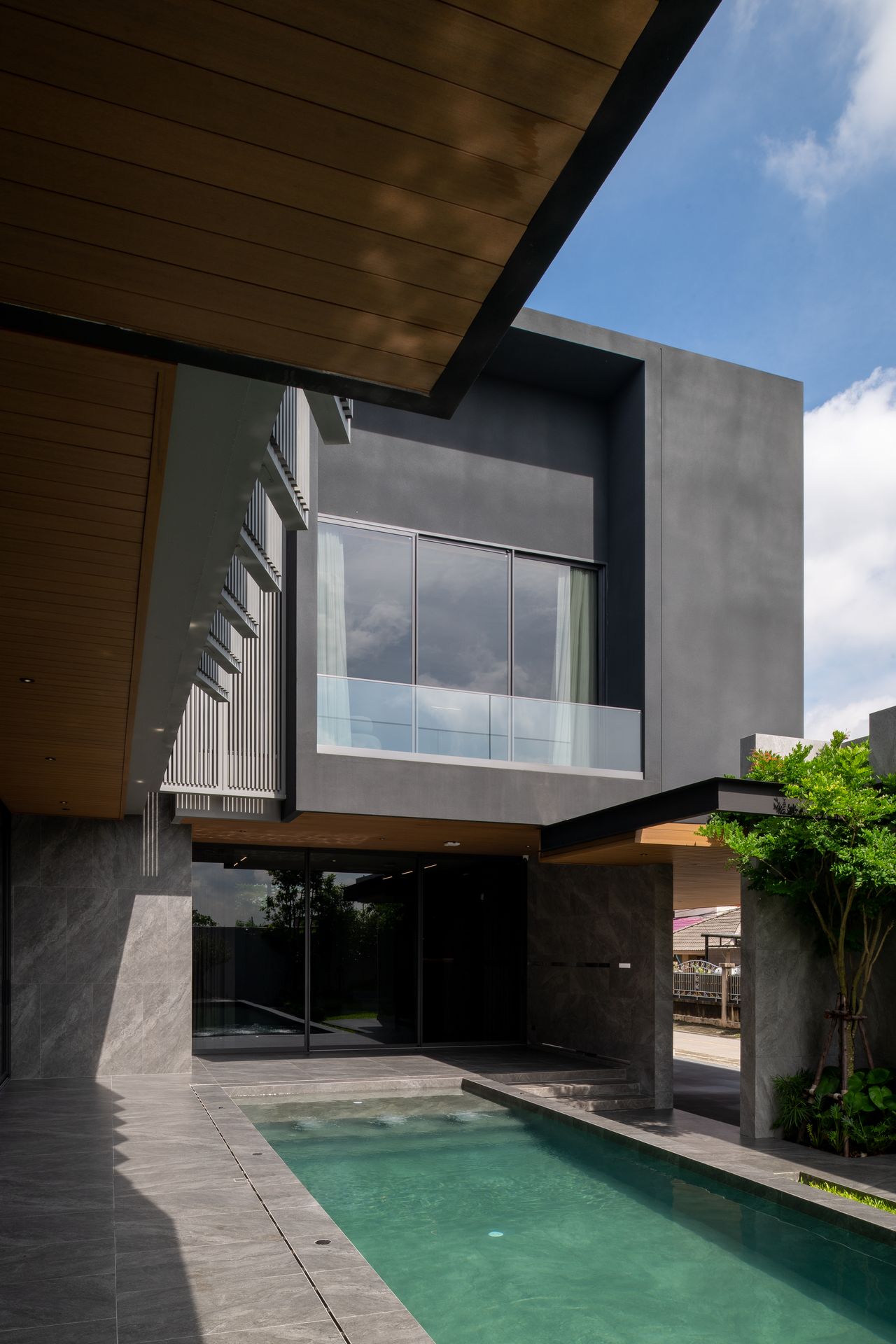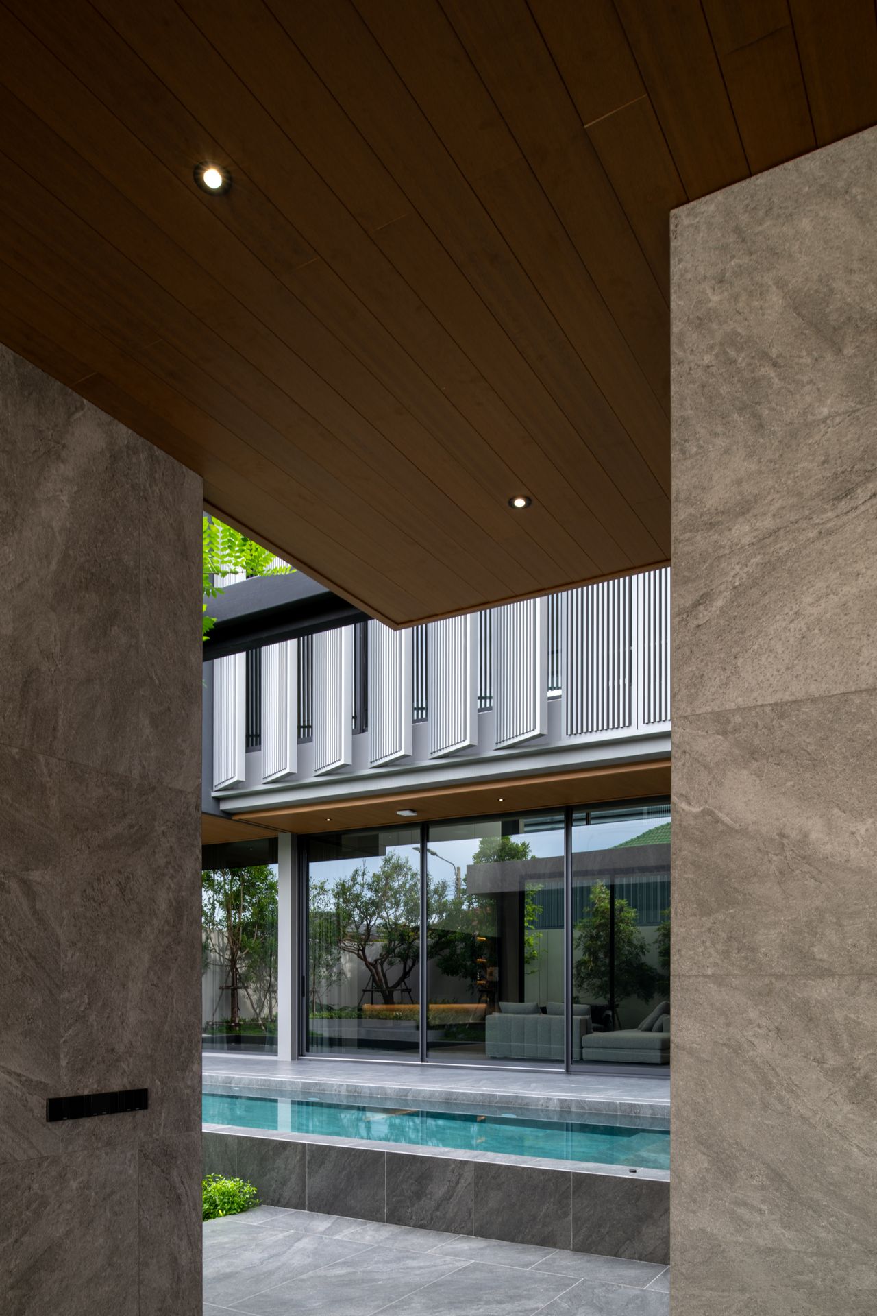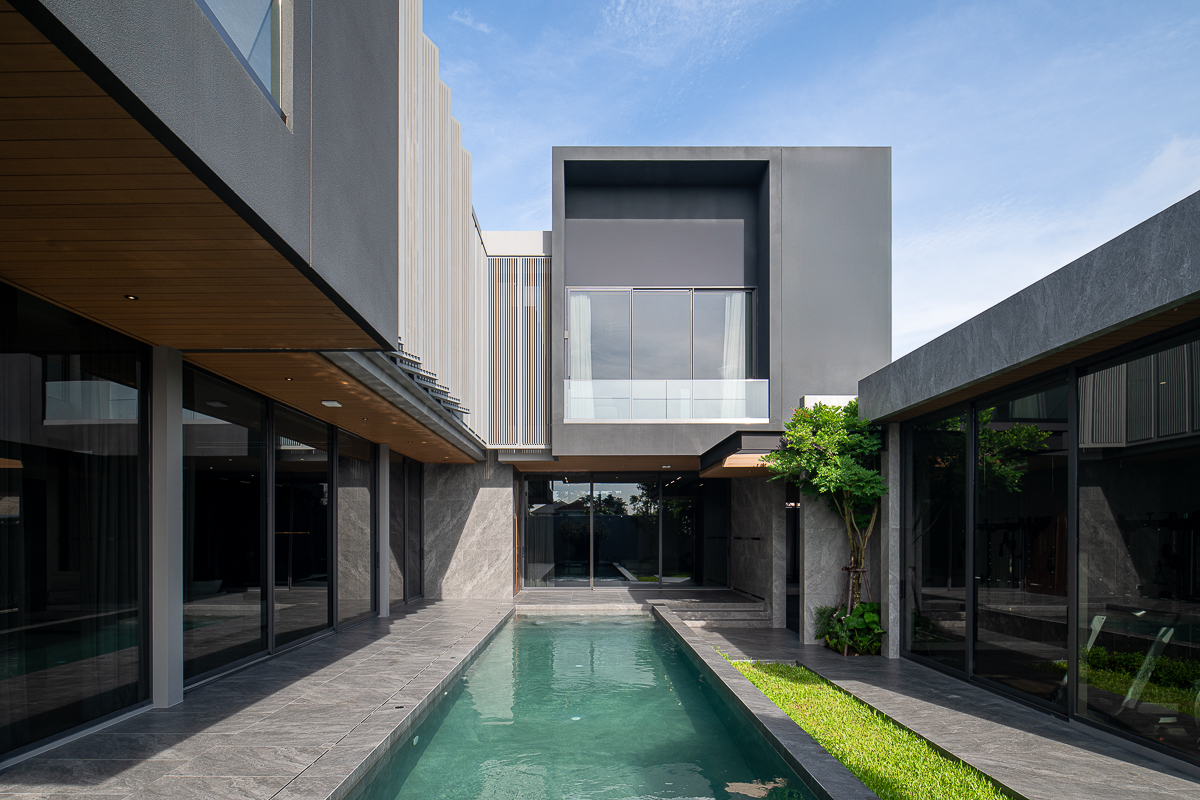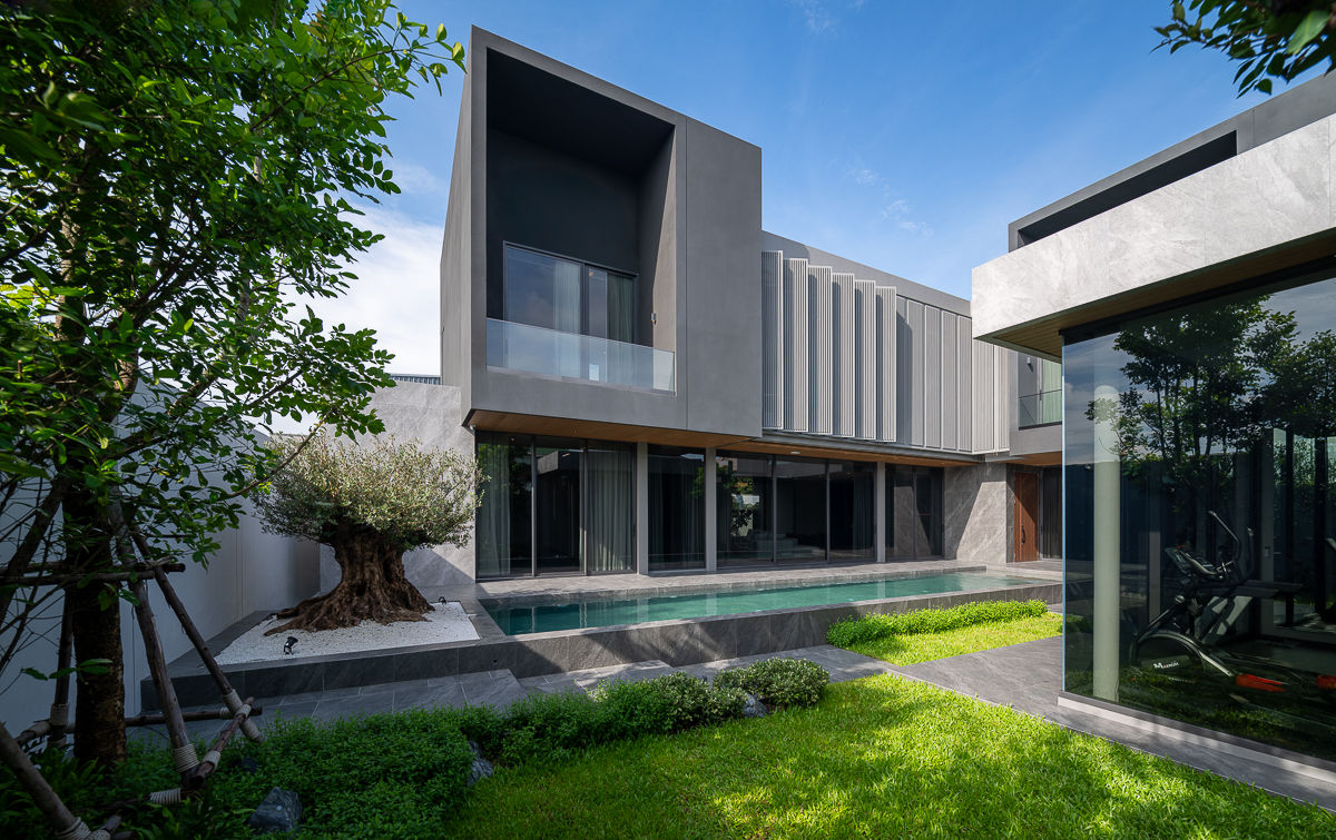 รูปทรงของอาคารถูกวางในลักษณะผสมผสานระหว่างตัว L และตัว U เพื่อสร้างพื้นที่ที่โอบล้อมและปิดตัวเองอย่างพอดี เสมือนเป็นเกราะกำบังจากภายนอก แต่ในขณะเดียวกันยังเชื่อมโยงภายในอย่างใกล้ชิด ฟังก์ชันการอยู่อาศัยถูกออกแบบให้สัมพันธ์กัน สะดวกต่อการใช้ชีวิตของสมาชิก