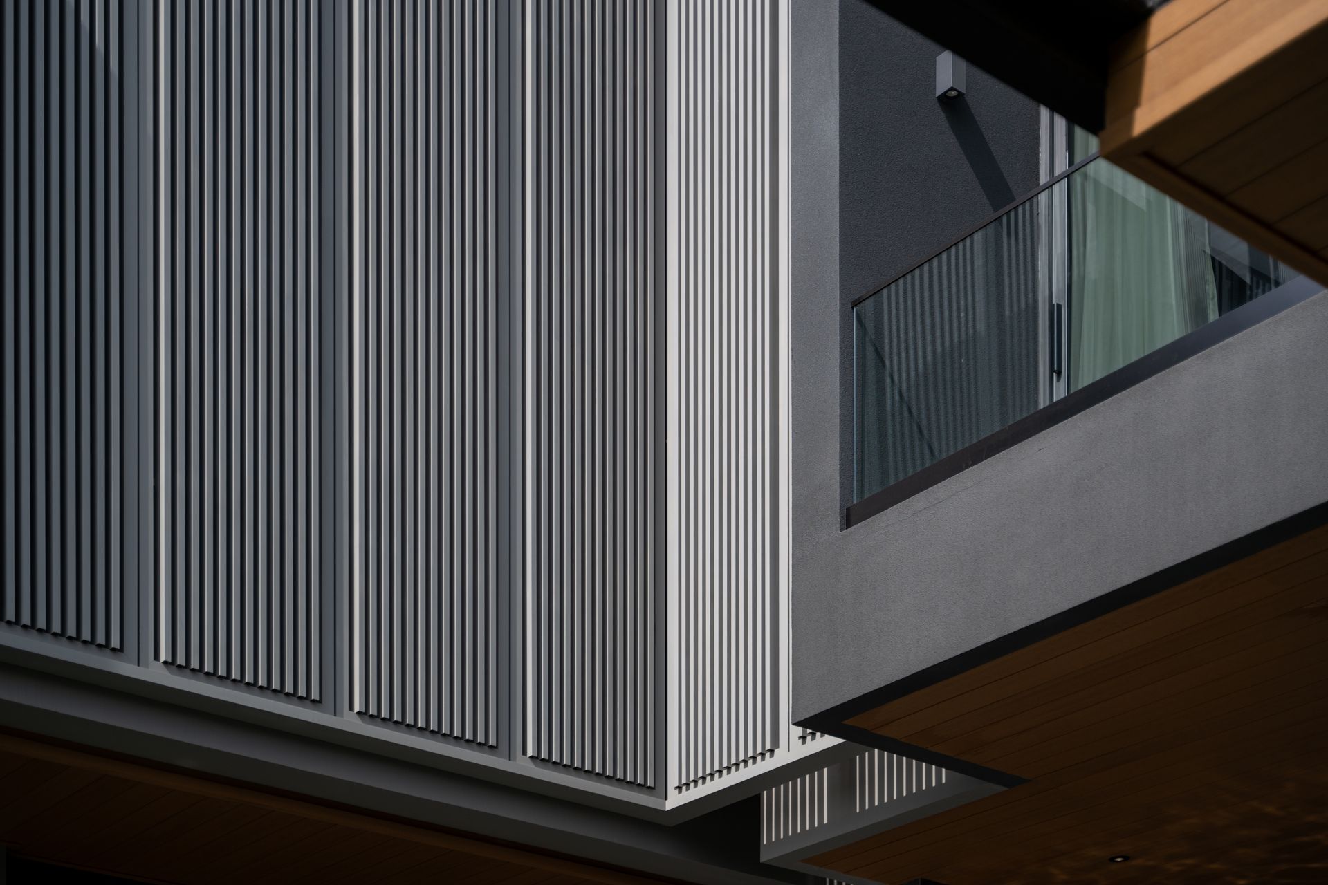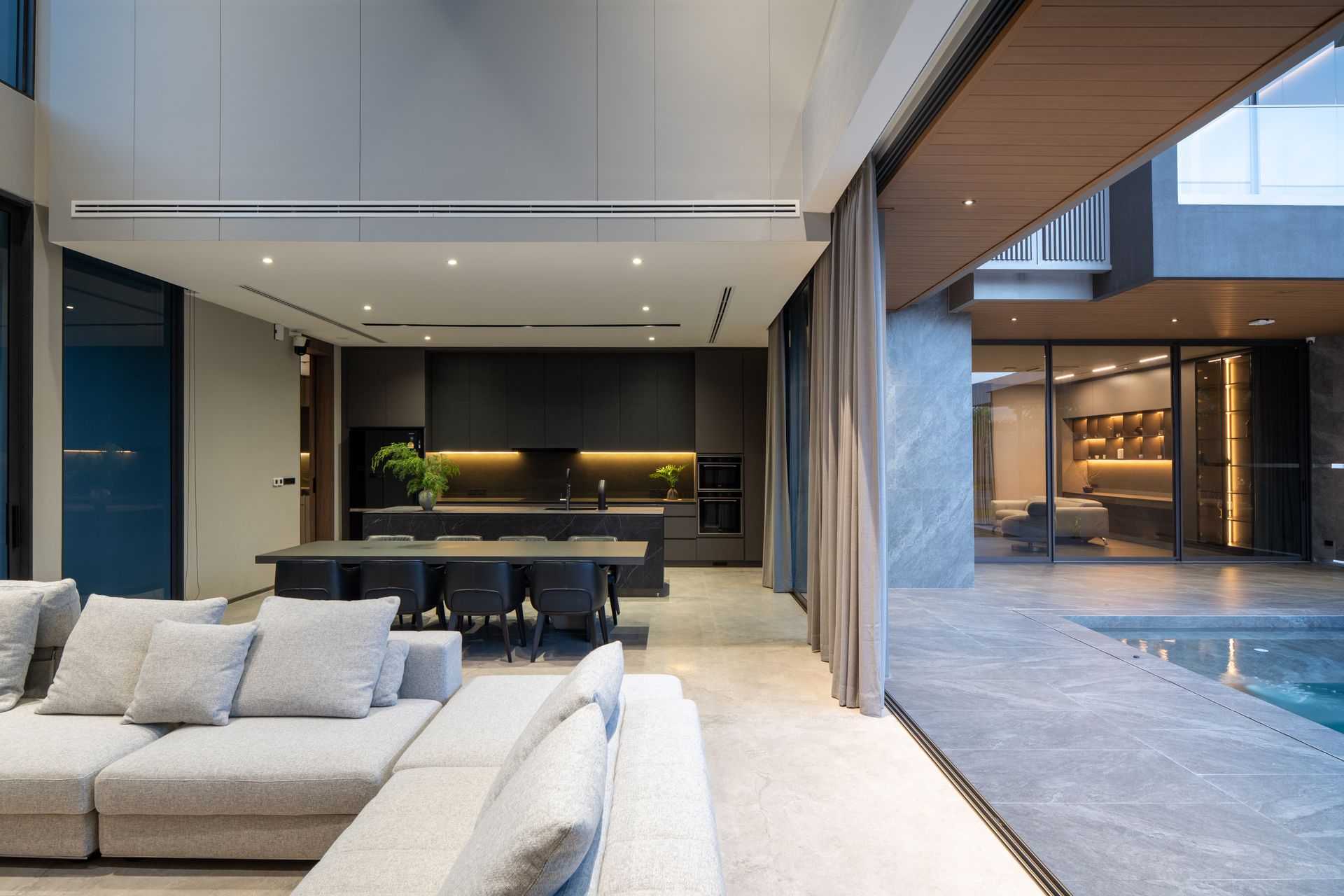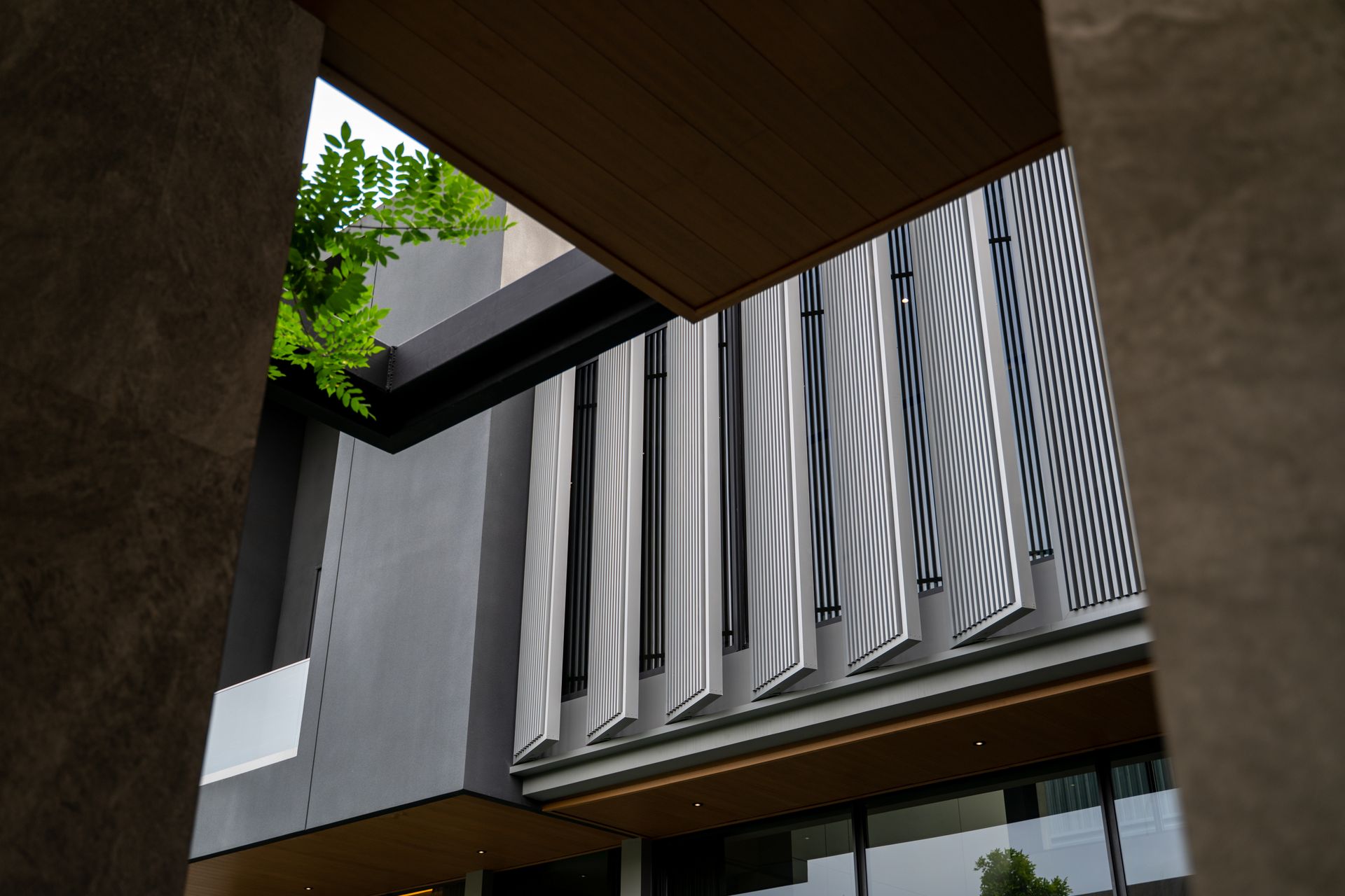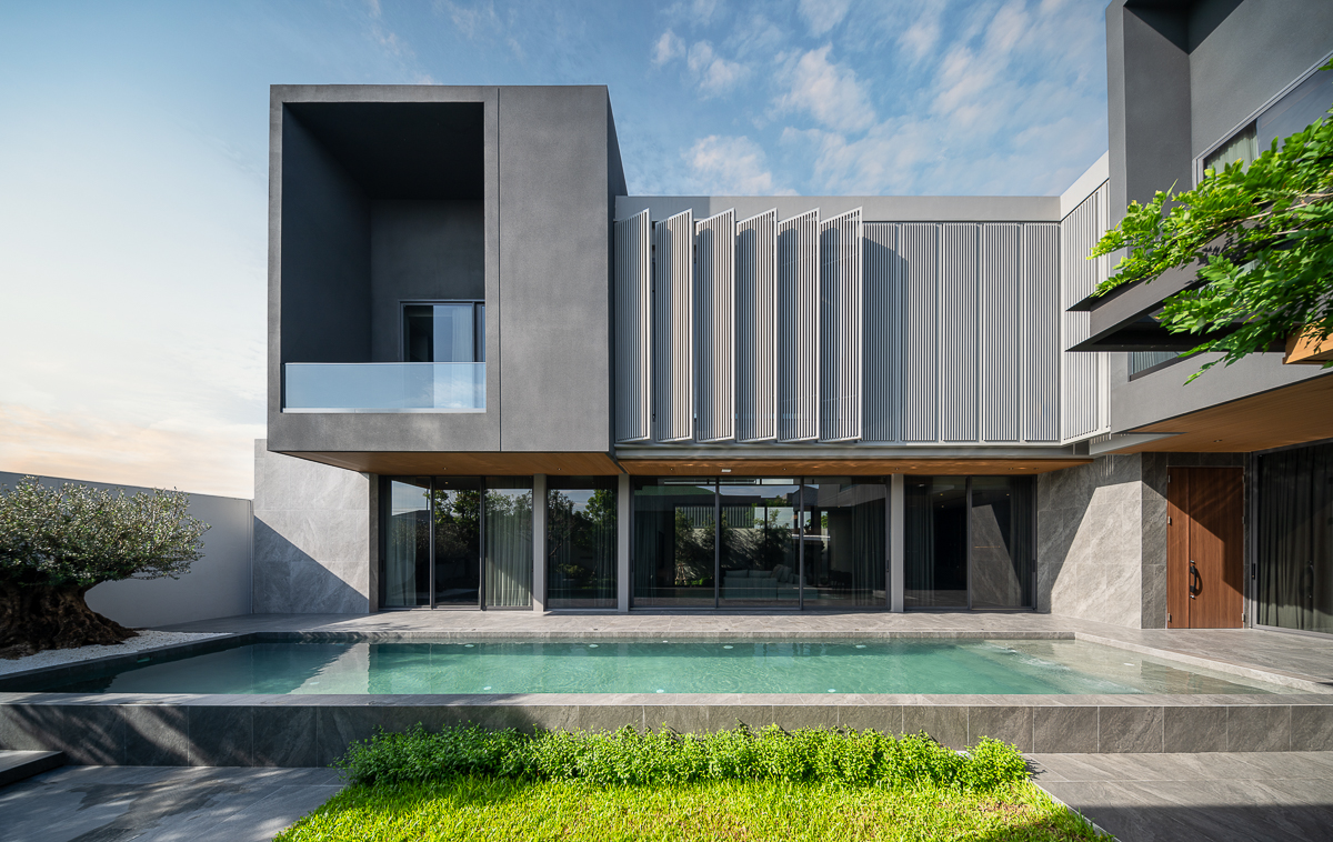 รูปทรงของอาคารถูกวางในลักษณะผสมผสานระหว่างตัว L และตัว U เพื่อสร้างพื้นที่ที่โอบล้อมและปิดตัวเองอย่างพอดี เสมือนเป็นเกราะกำบังจากภายนอก แต่ในขณะเดียวกันยังเชื่อมโยงภายในอย่างใกล้ชิด ฟังก์ชันการอยู่อาศัยถูกออกแบบให้สัมพันธ์กัน สะดวกต่อการใช้ชีวิตของสมาชิก