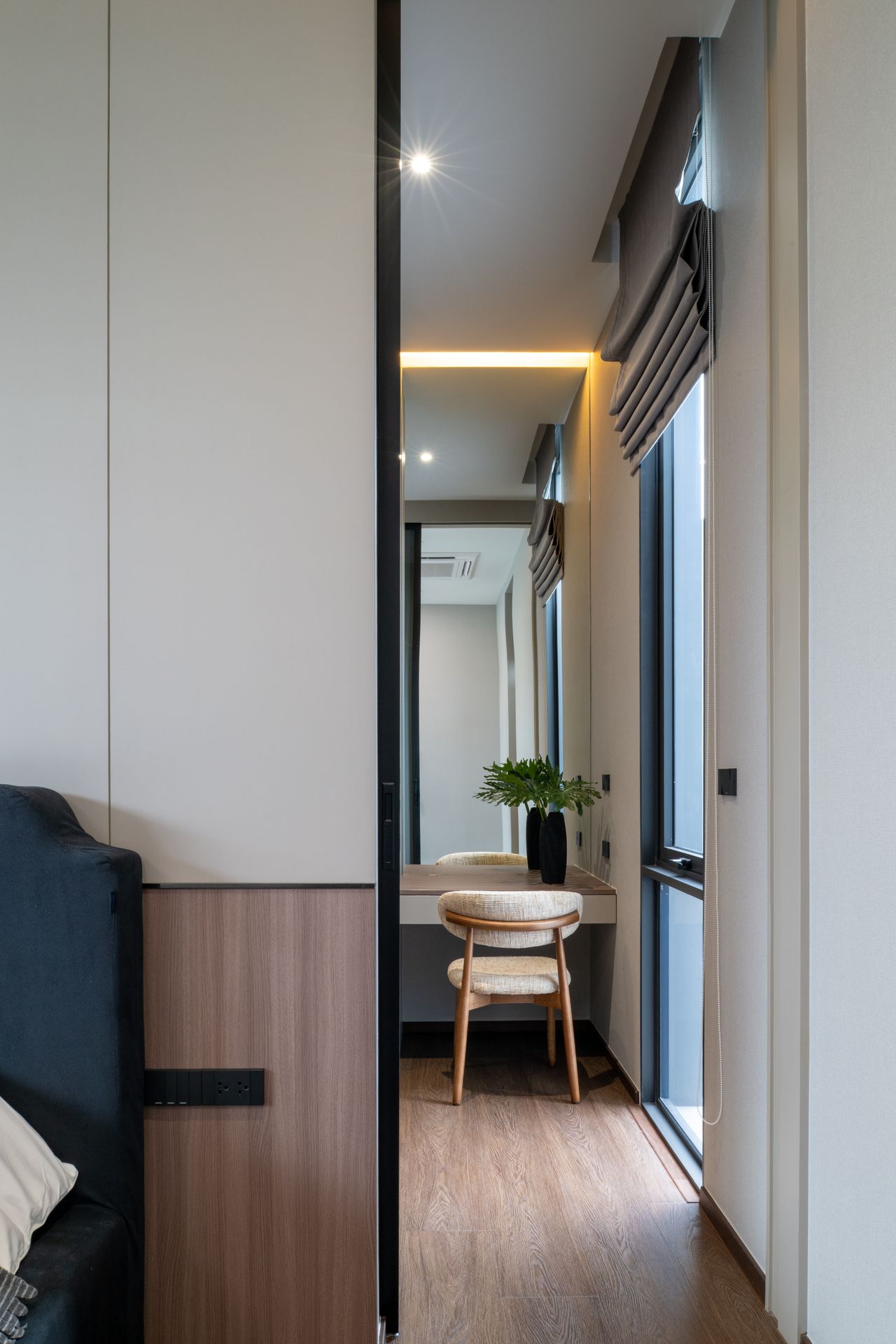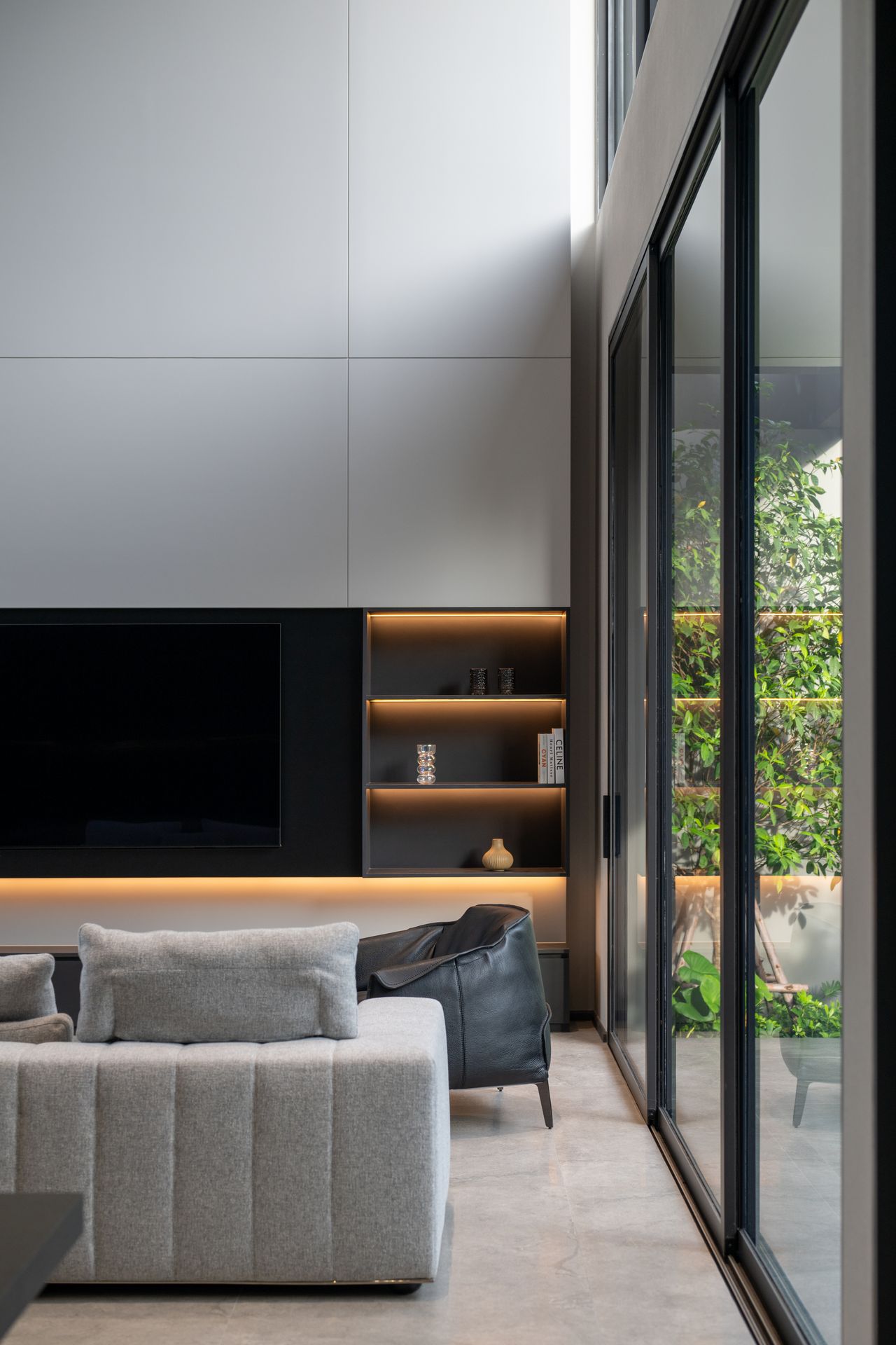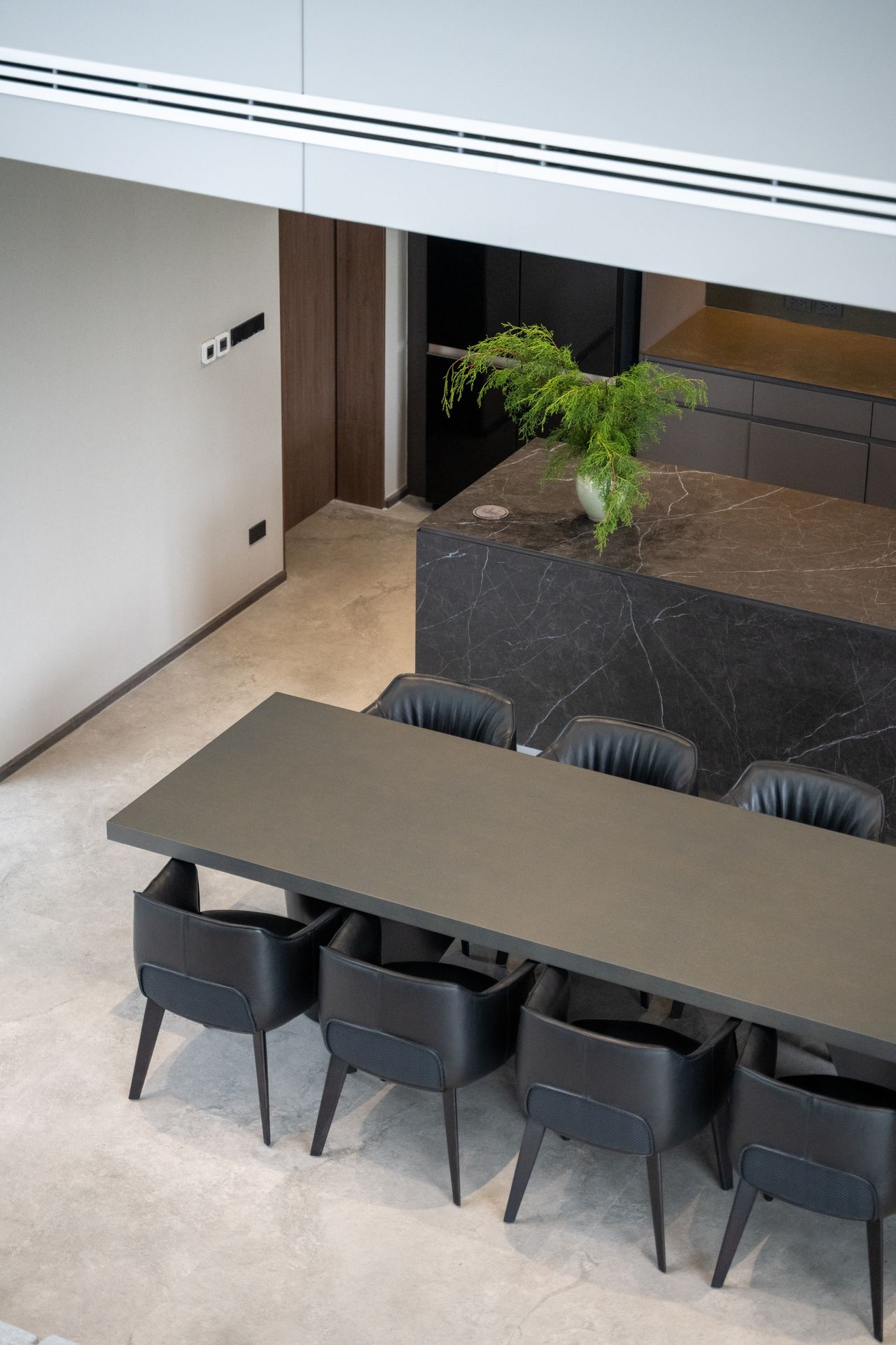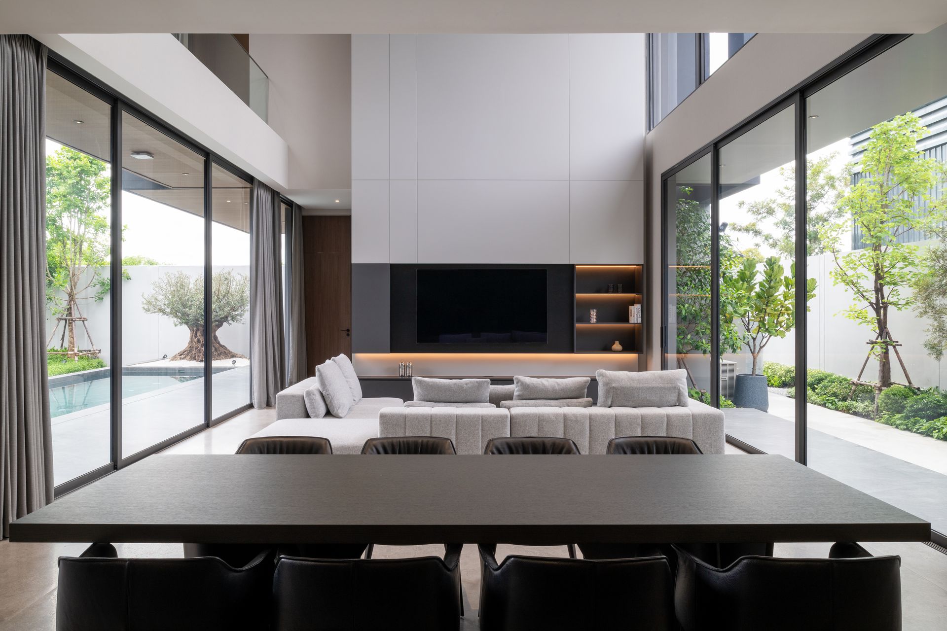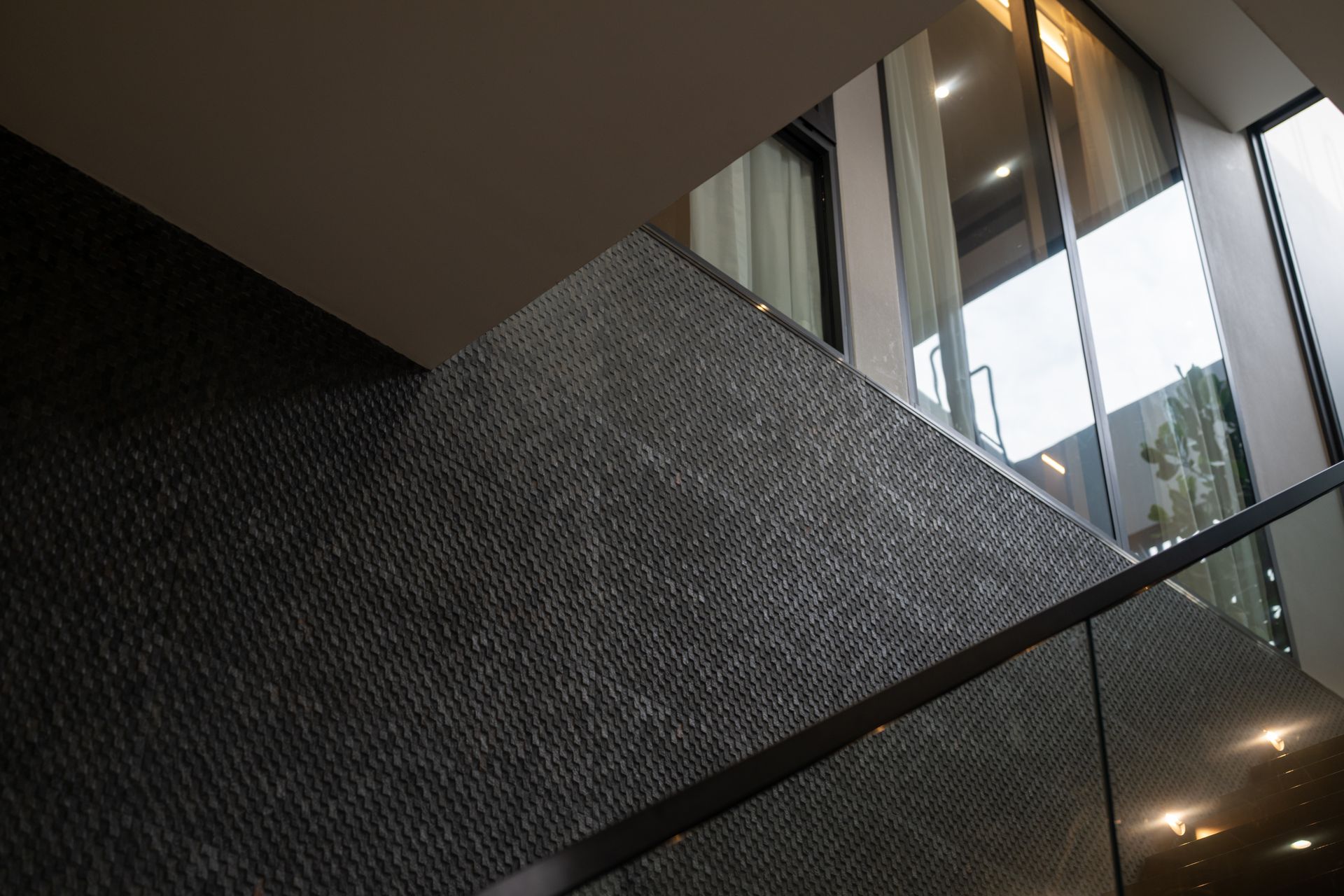 “ไร้ประกาย” ยังถูกสะท้อนผ่านการเลือกใช้วัสดุทุกชนิดในรูปแบบผิวด้าน (matte finish) ทั้งหมด ไม่ว่าจะเป็นพื้น ผนัง ฝ้า ไปจนถึงเฟอร์นิเจอร์ การลดทอนแสงสะท้อนทำให้บ้านดูสงบนิ่ง เรียบง่าย เน้นบรรยากาศความเป็นส่วนตัว
