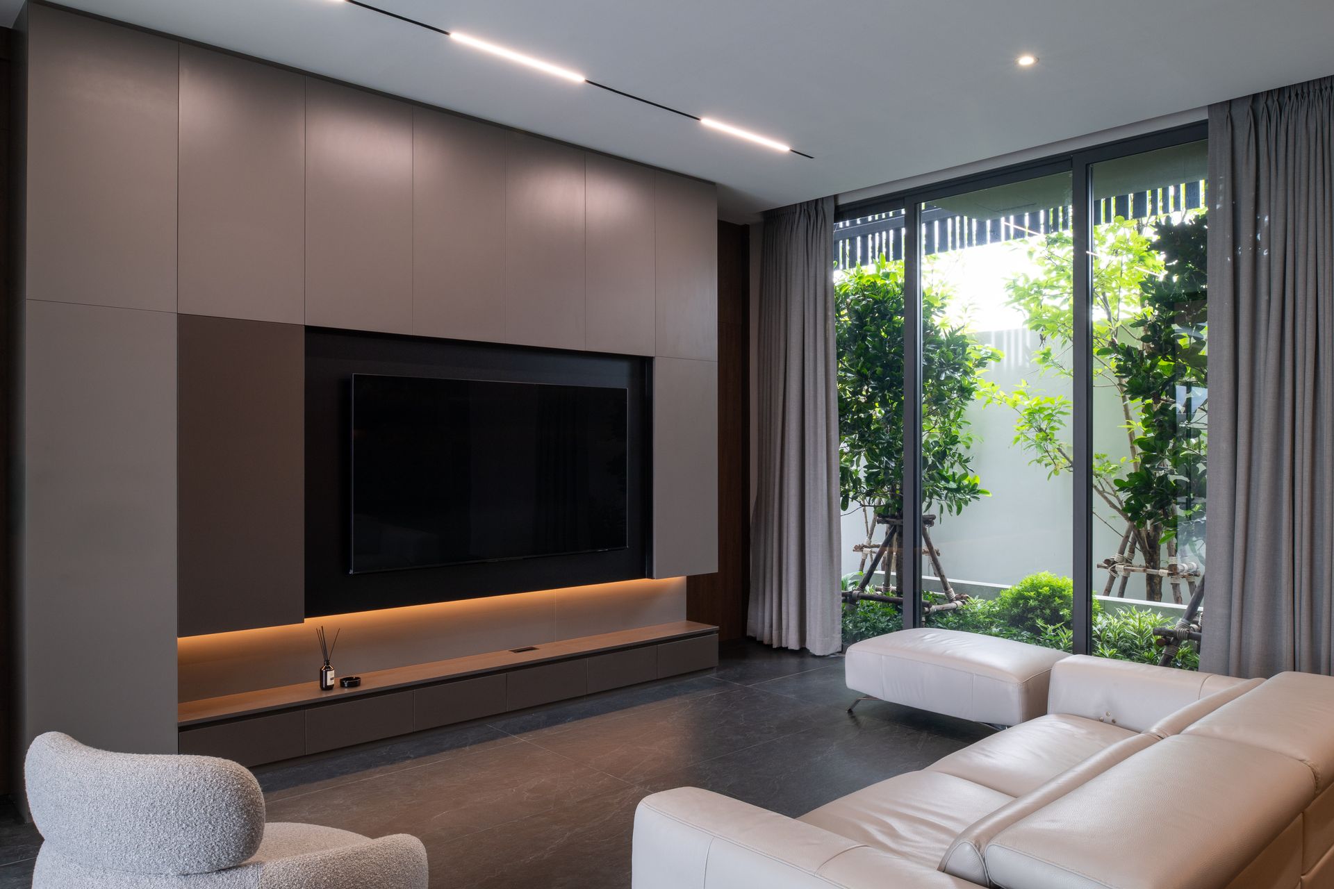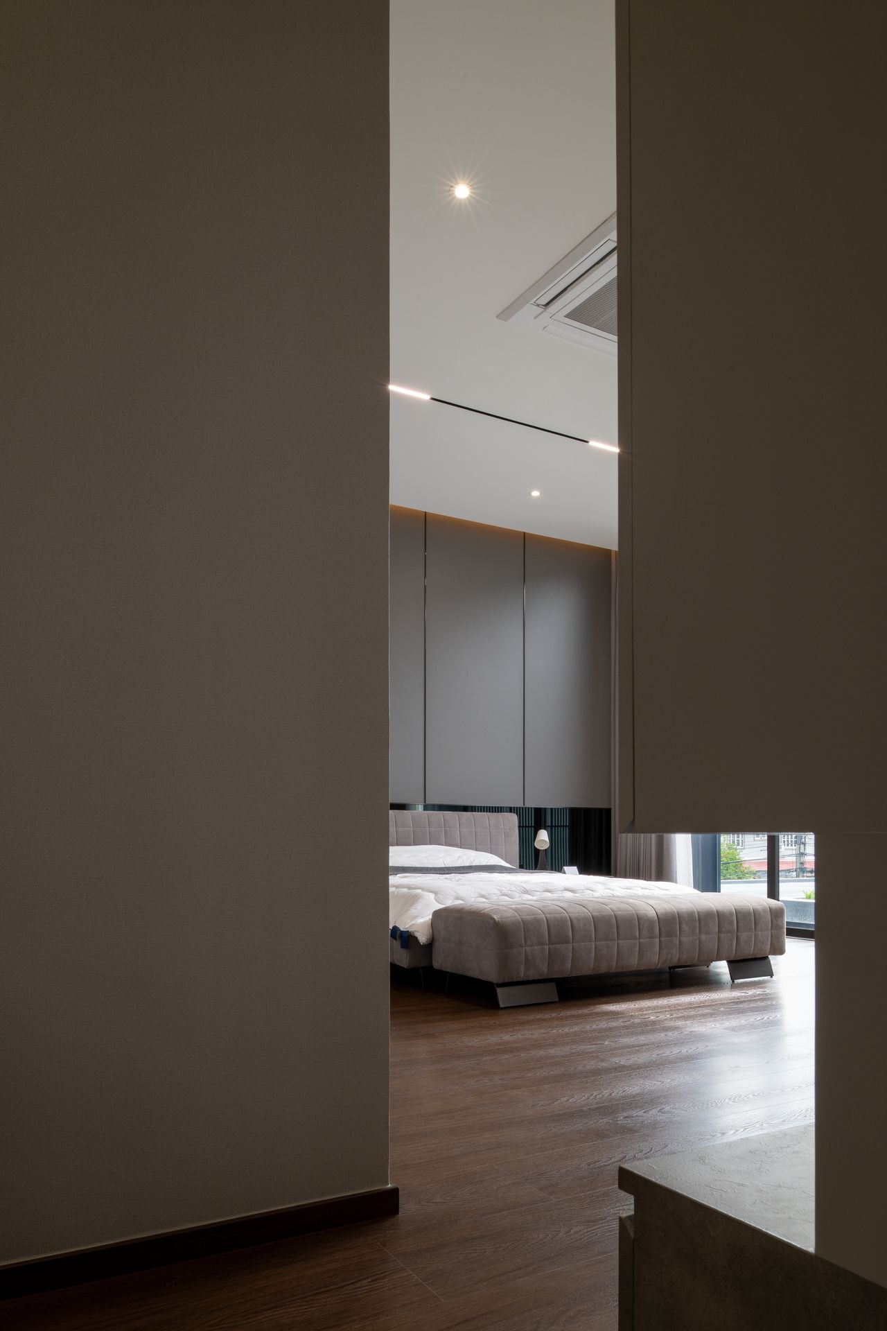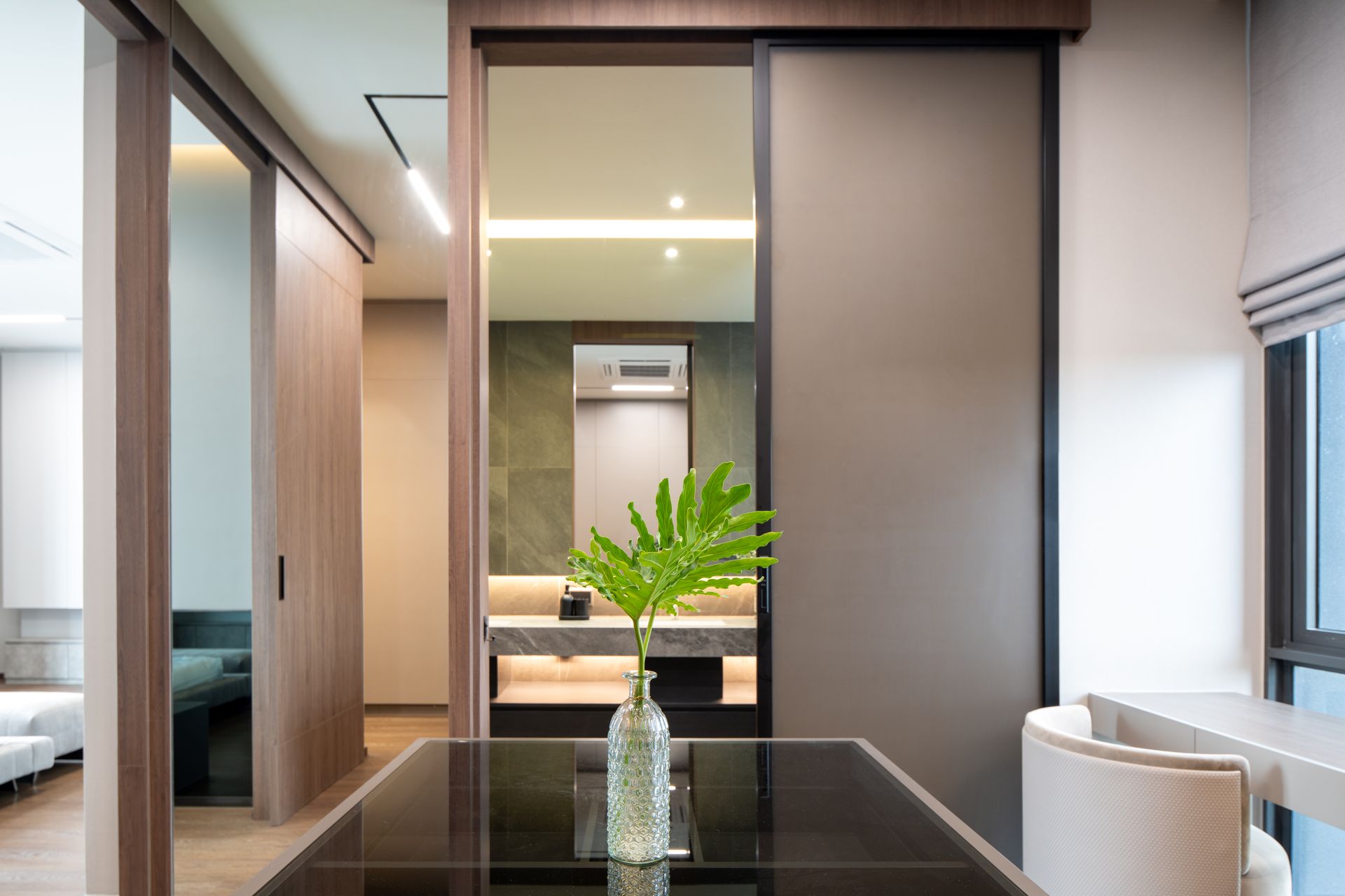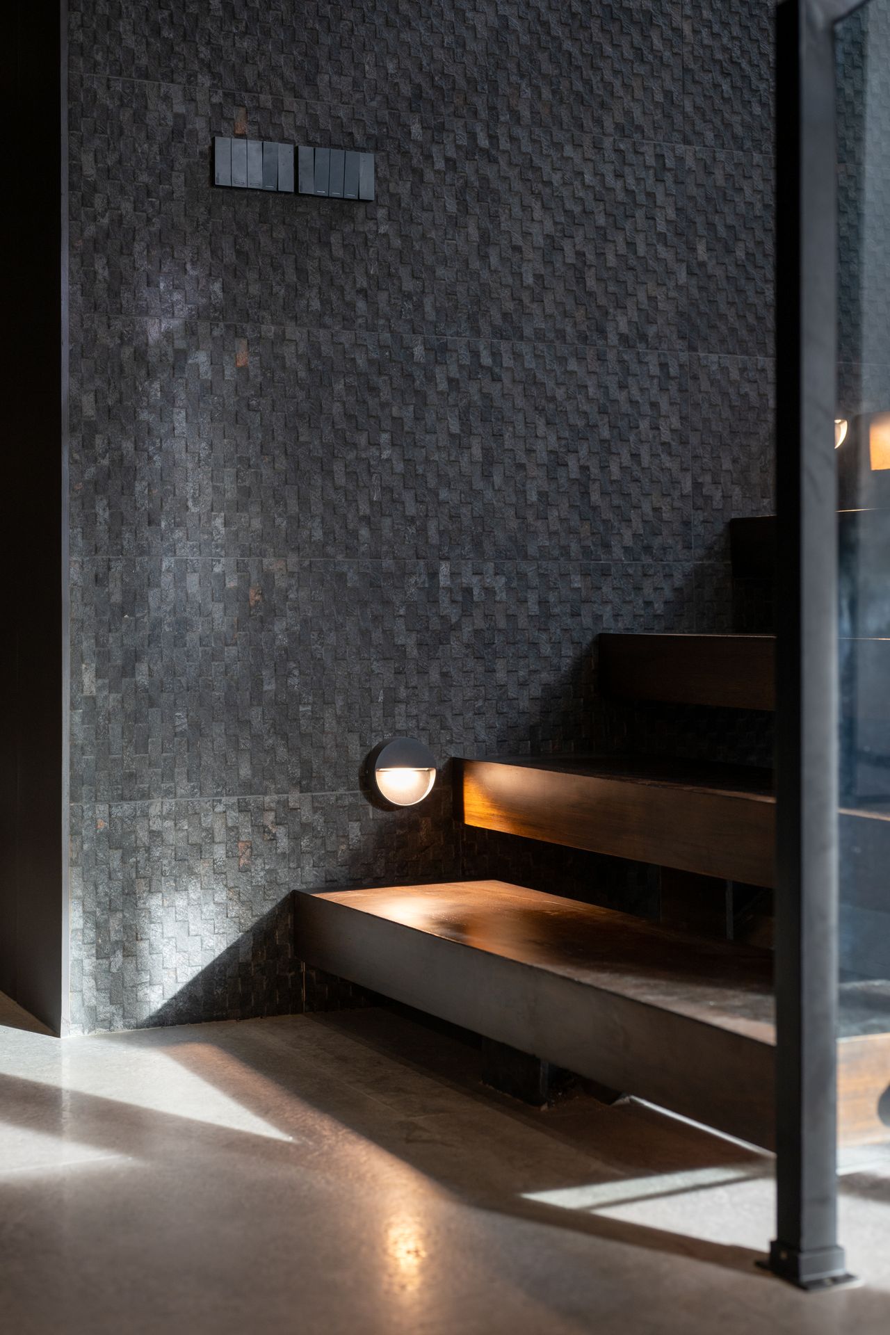 “ไร้ประกาย” ยังถูกสะท้อนผ่านการเลือกใช้วัสดุทุกชนิดในรูปแบบผิวด้าน (matte finish) ทั้งหมด ไม่ว่าจะเป็นพื้น ผนัง ฝ้า ไปจนถึงเฟอร์นิเจอร์ การลดทอนแสงสะท้อนทำให้บ้านดูสงบนิ่ง เรียบง่าย เน้นบรรยากาศความเป็นส่วนตัว