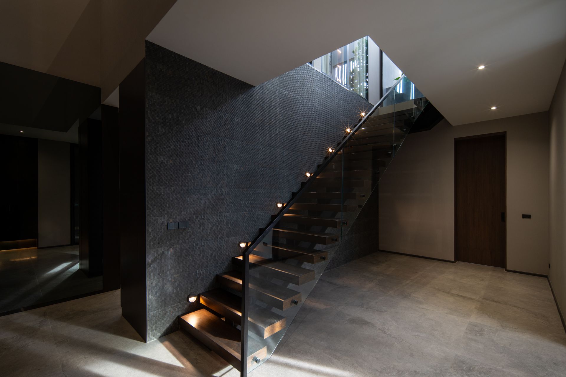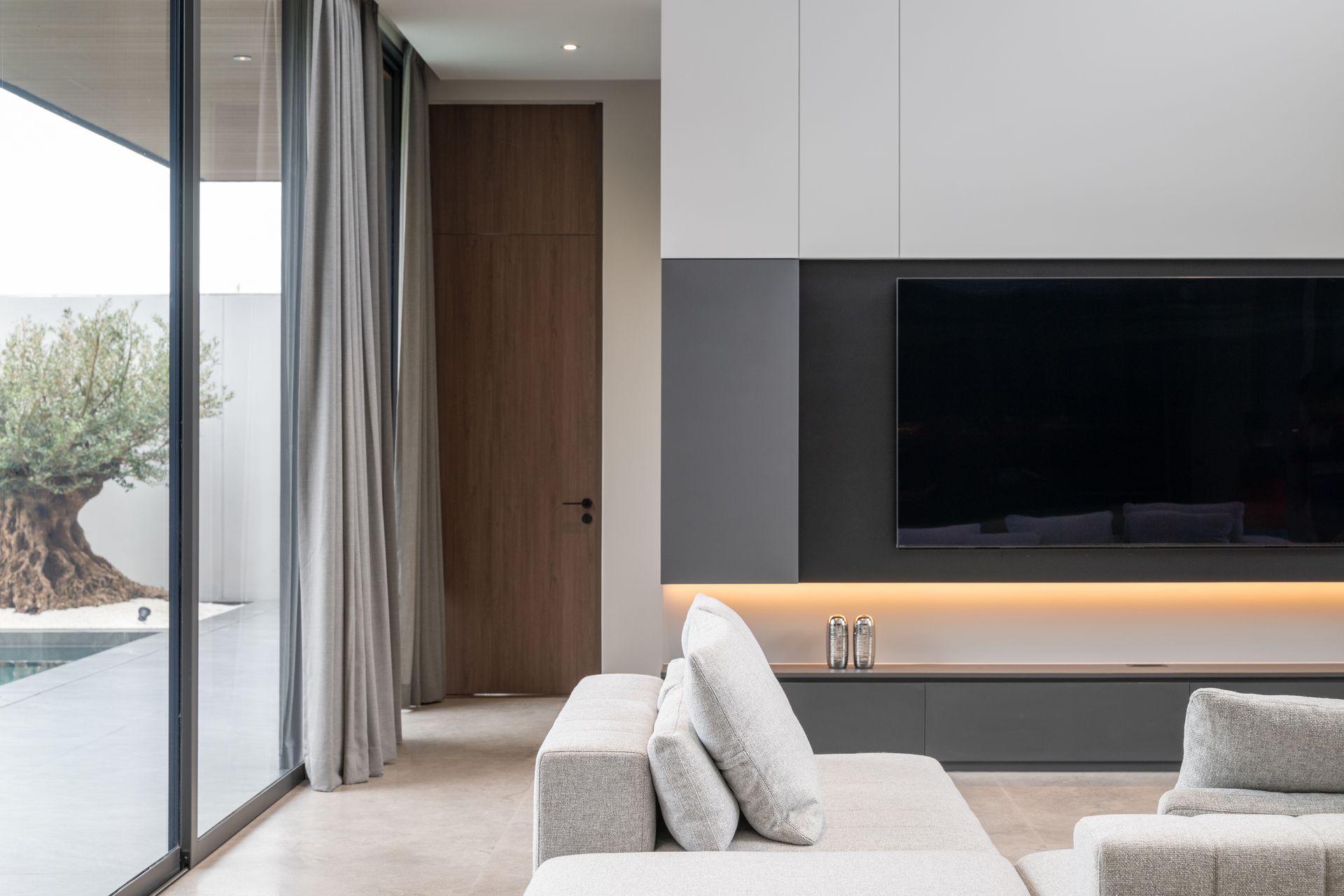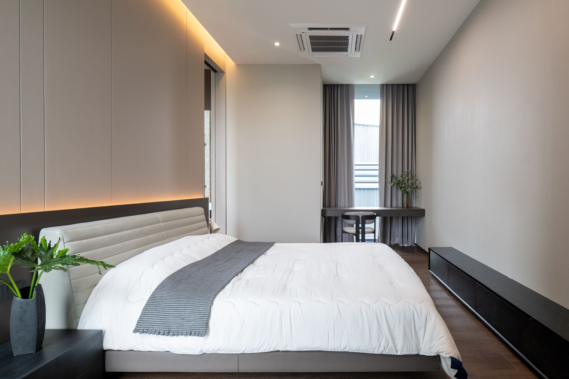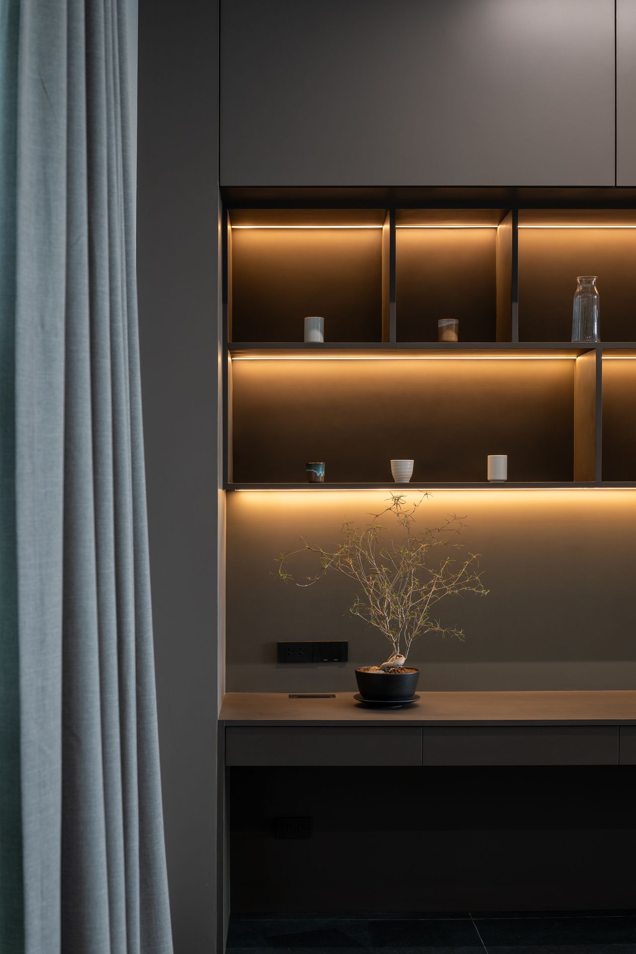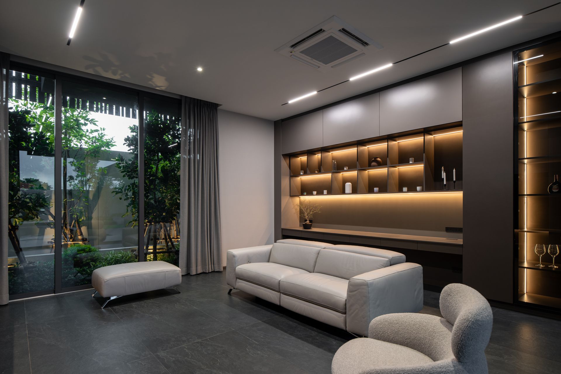 “ไร้ประกาย” ยังถูกสะท้อนผ่านการเลือกใช้วัสดุทุกชนิดในรูปแบบผิวด้าน (matte finish) ทั้งหมด ไม่ว่าจะเป็นพื้น ผนัง ฝ้า ไปจนถึงเฟอร์นิเจอร์ การลดทอนแสงสะท้อนทำให้บ้านดูสงบนิ่ง เรียบง่าย เน้นบรรยากาศความเป็นส่วนตัว