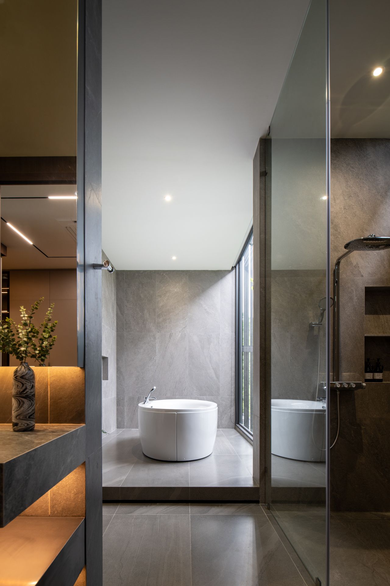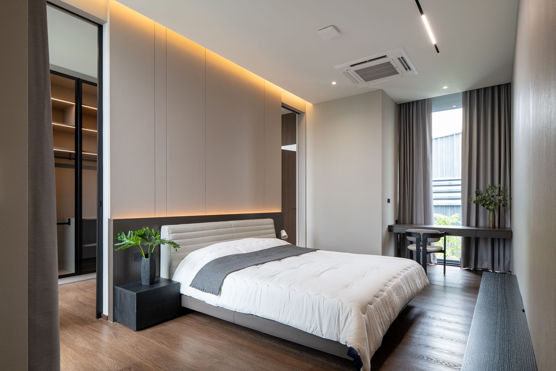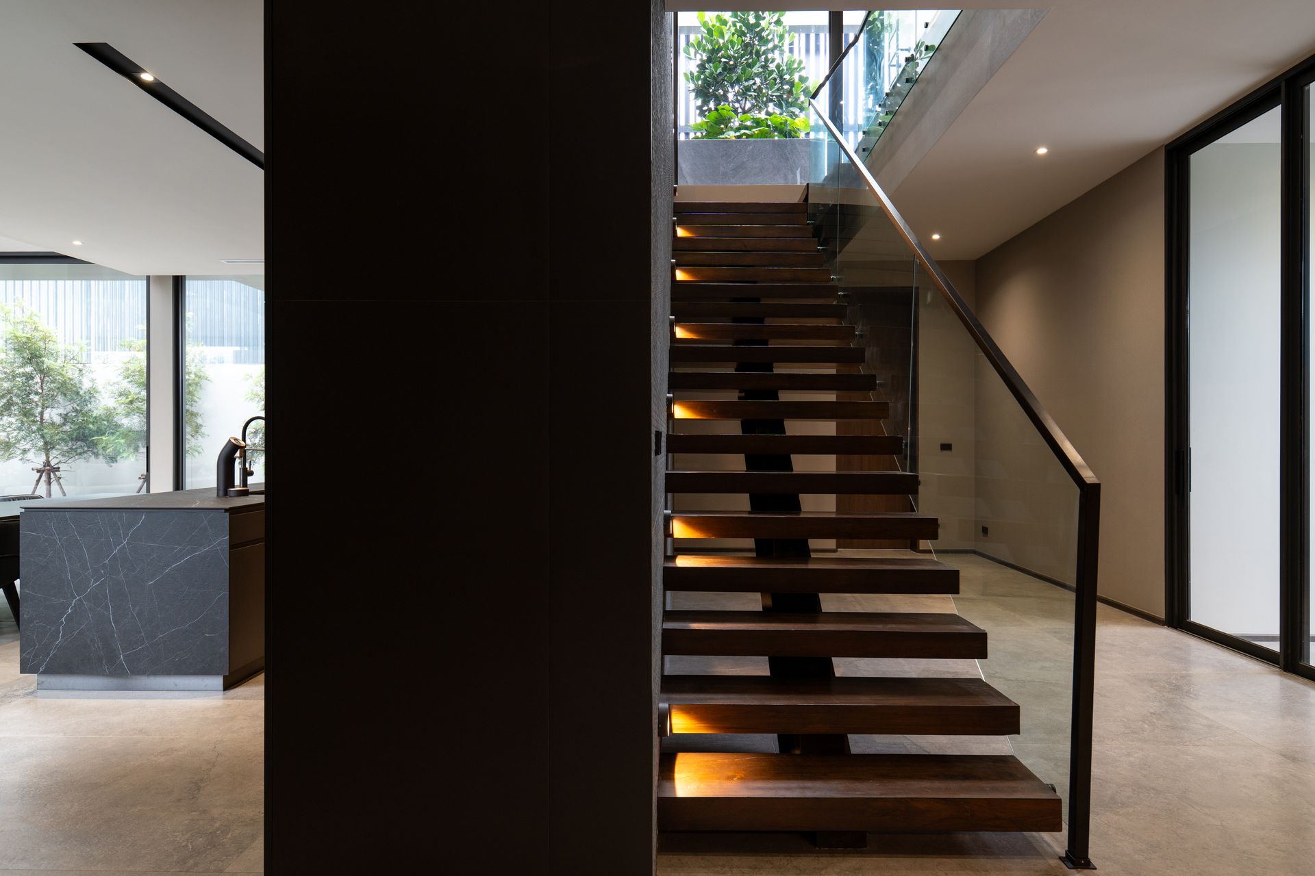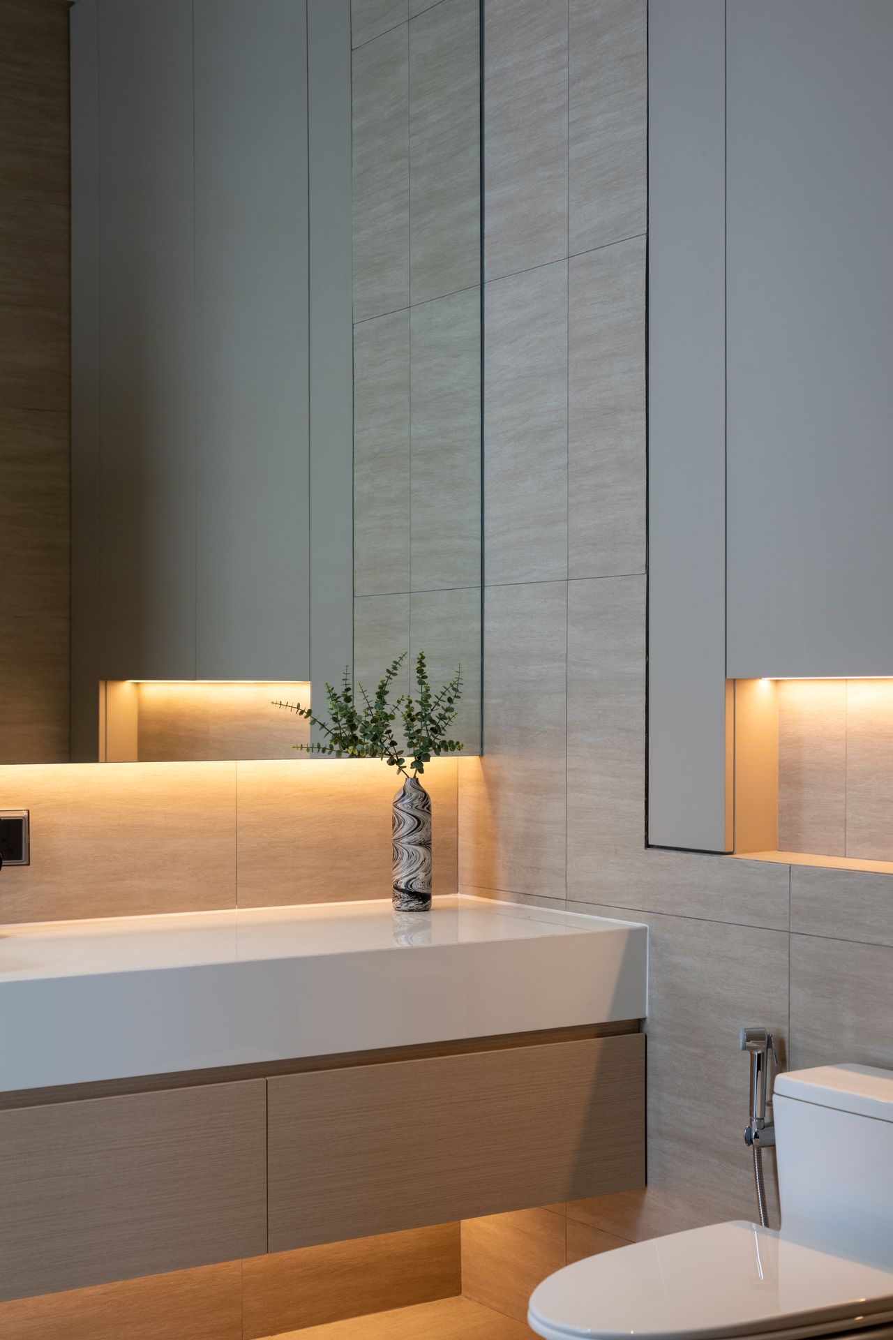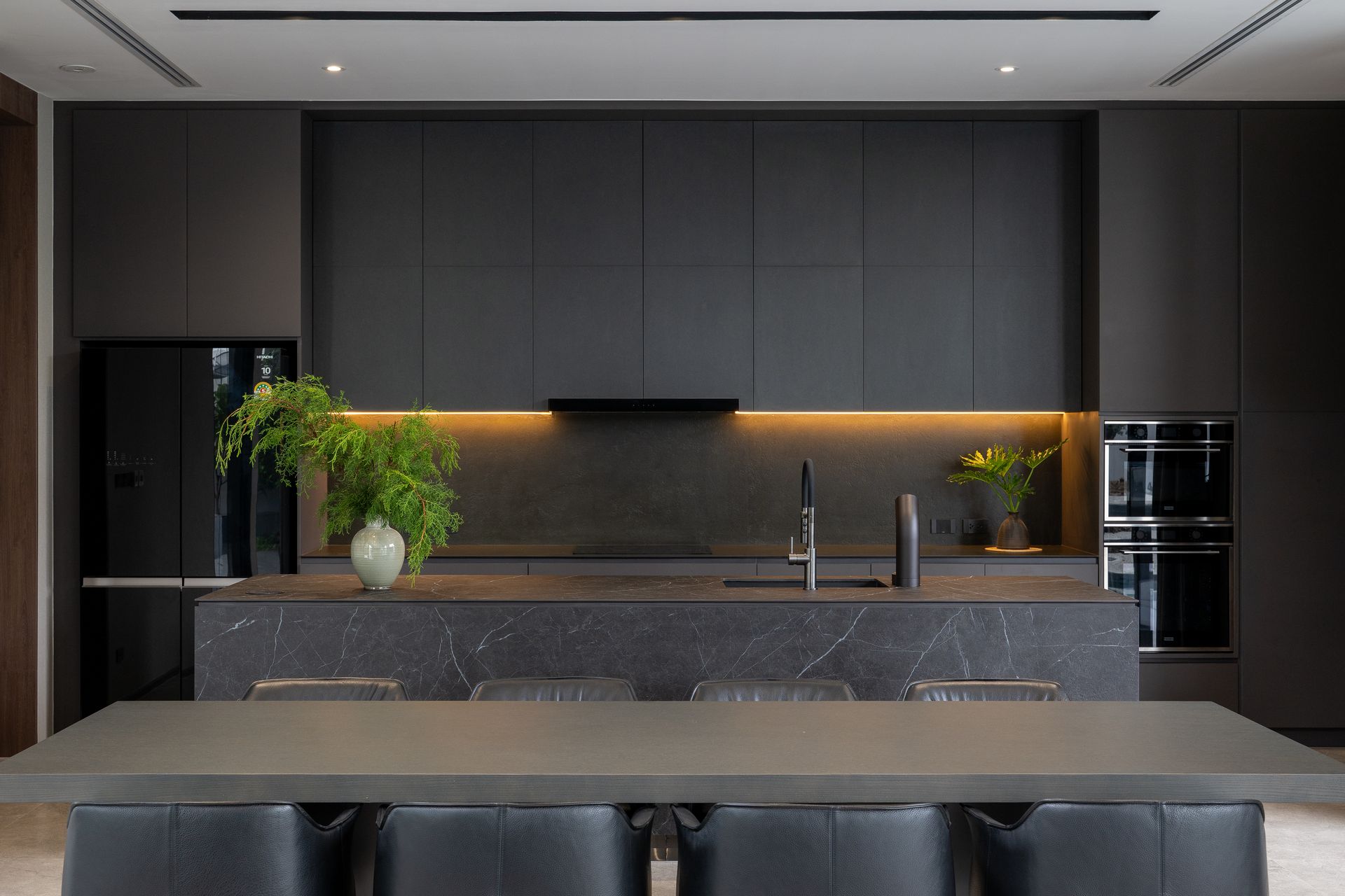 “ไร้ประกาย” ยังถูกสะท้อนผ่านการเลือกใช้วัสดุทุกชนิดในรูปแบบผิวด้าน (matte finish) ทั้งหมด ไม่ว่าจะเป็นพื้น ผนัง ฝ้า ไปจนถึงเฟอร์นิเจอร์ การลดทอนแสงสะท้อนทำให้บ้านดูสงบนิ่ง เรียบง่าย เน้นบรรยากาศความเป็นส่วนตัว