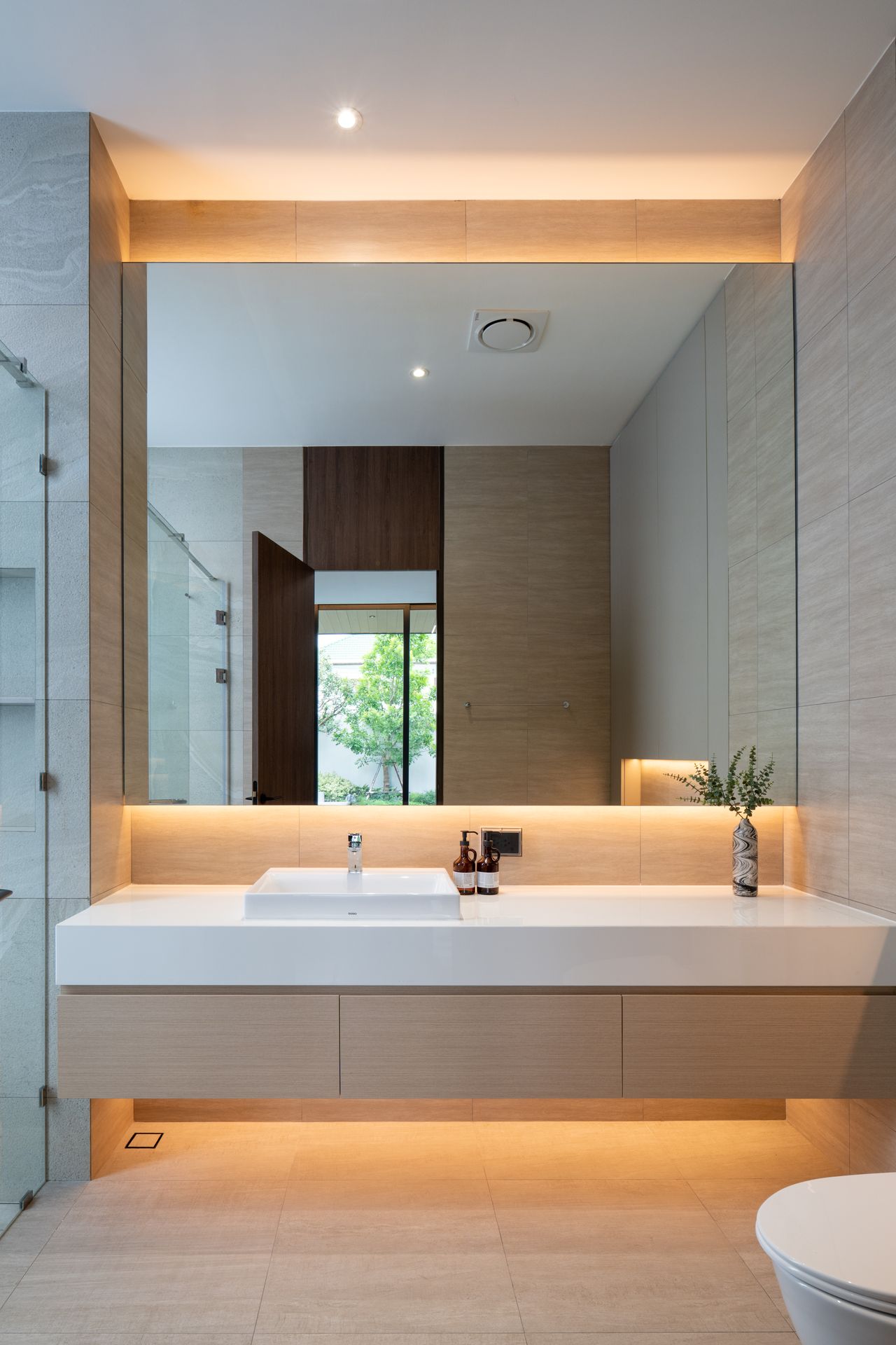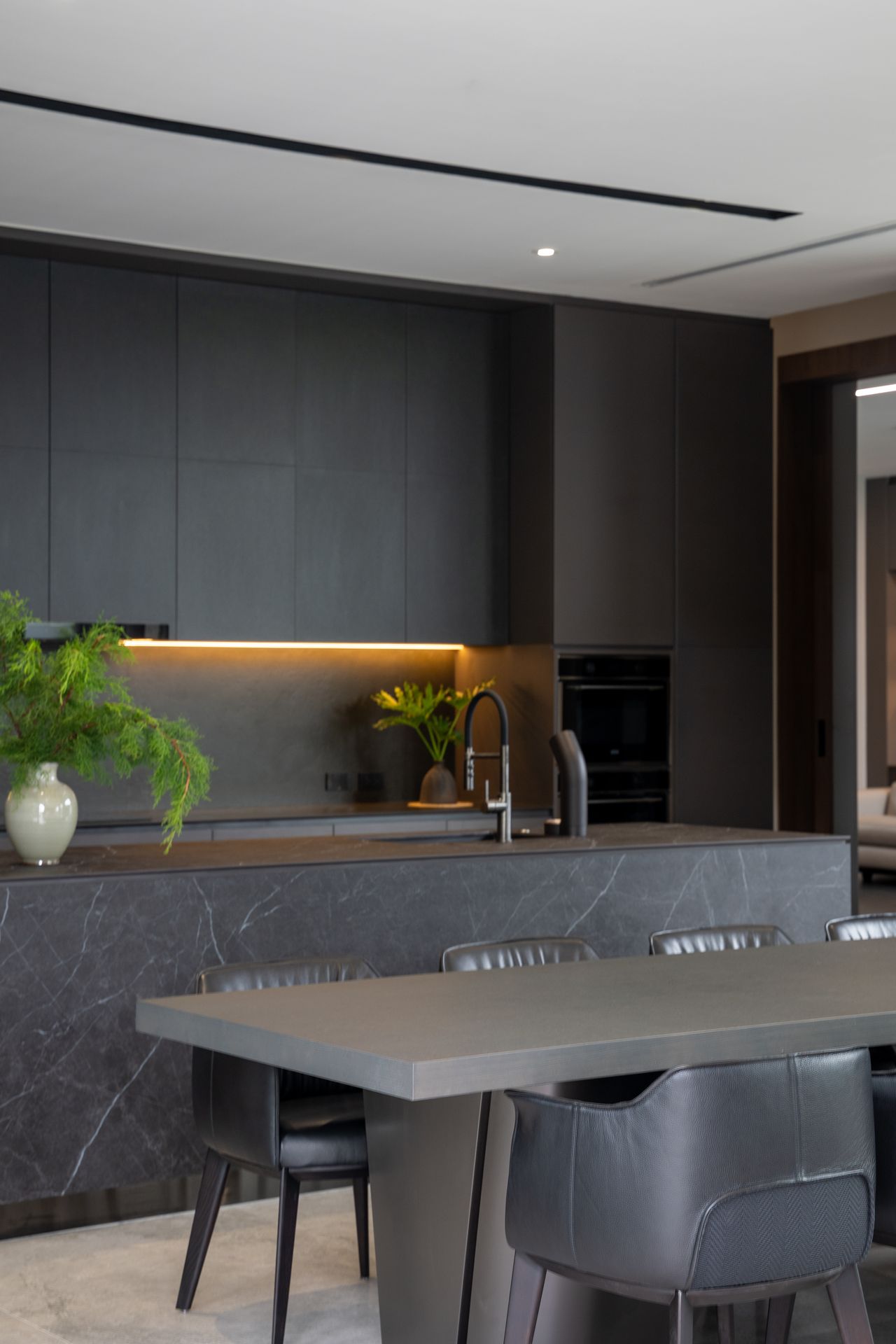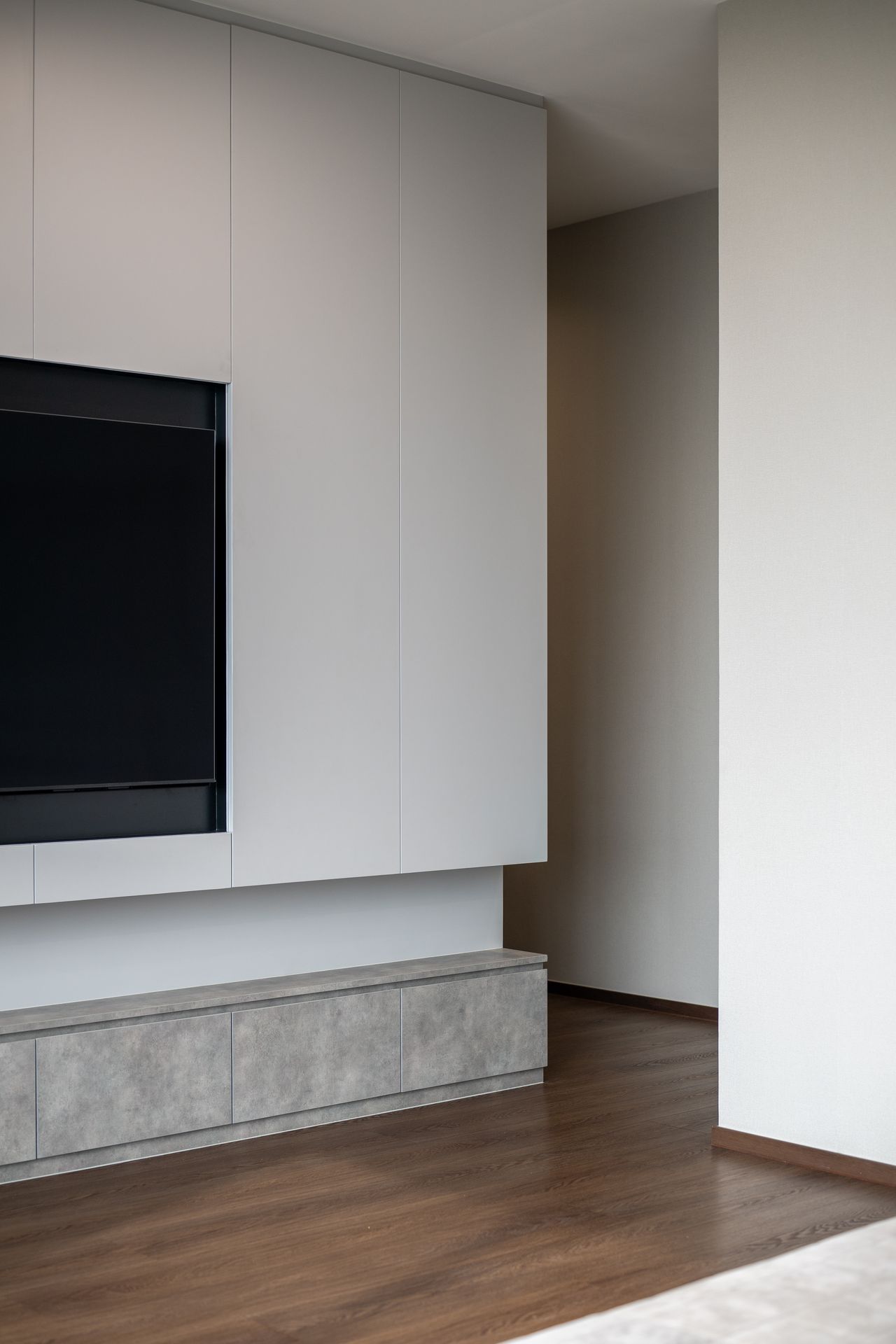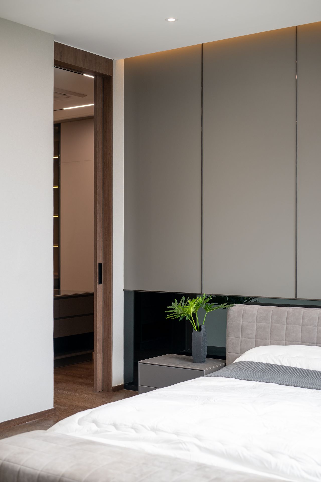 “ไร้ประกาย” ยังถูกสะท้อนผ่านการเลือกใช้วัสดุทุกชนิดในรูปแบบผิวด้าน (matte finish) ทั้งหมด ไม่ว่าจะเป็นพื้น ผนัง ฝ้า ไปจนถึงเฟอร์นิเจอร์ การลดทอนแสงสะท้อนทำให้บ้านดูสงบนิ่ง เรียบง่าย เน้นบรรยากาศความเป็นส่วนตัว