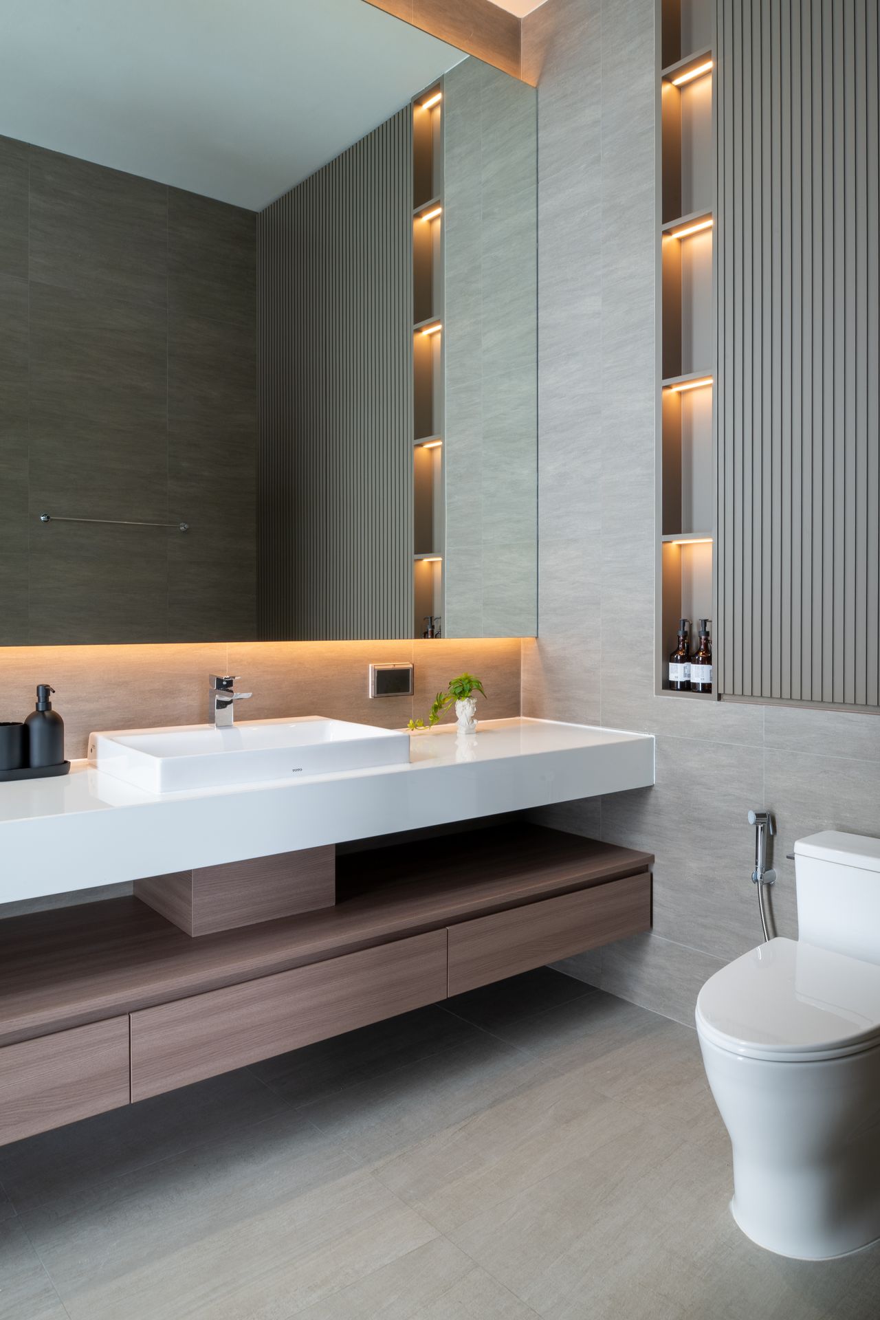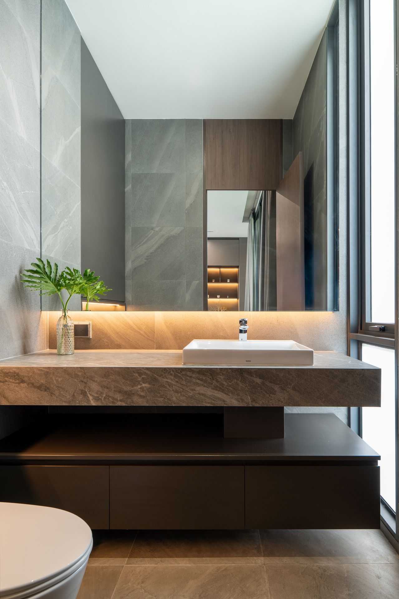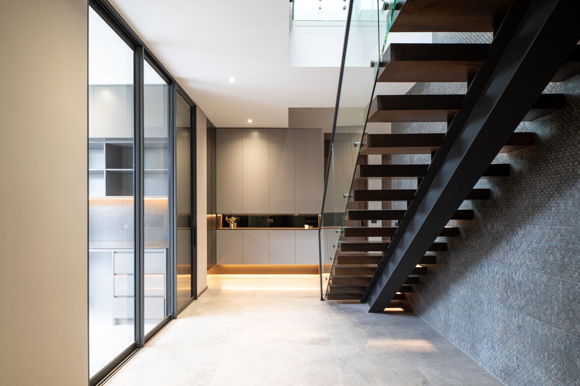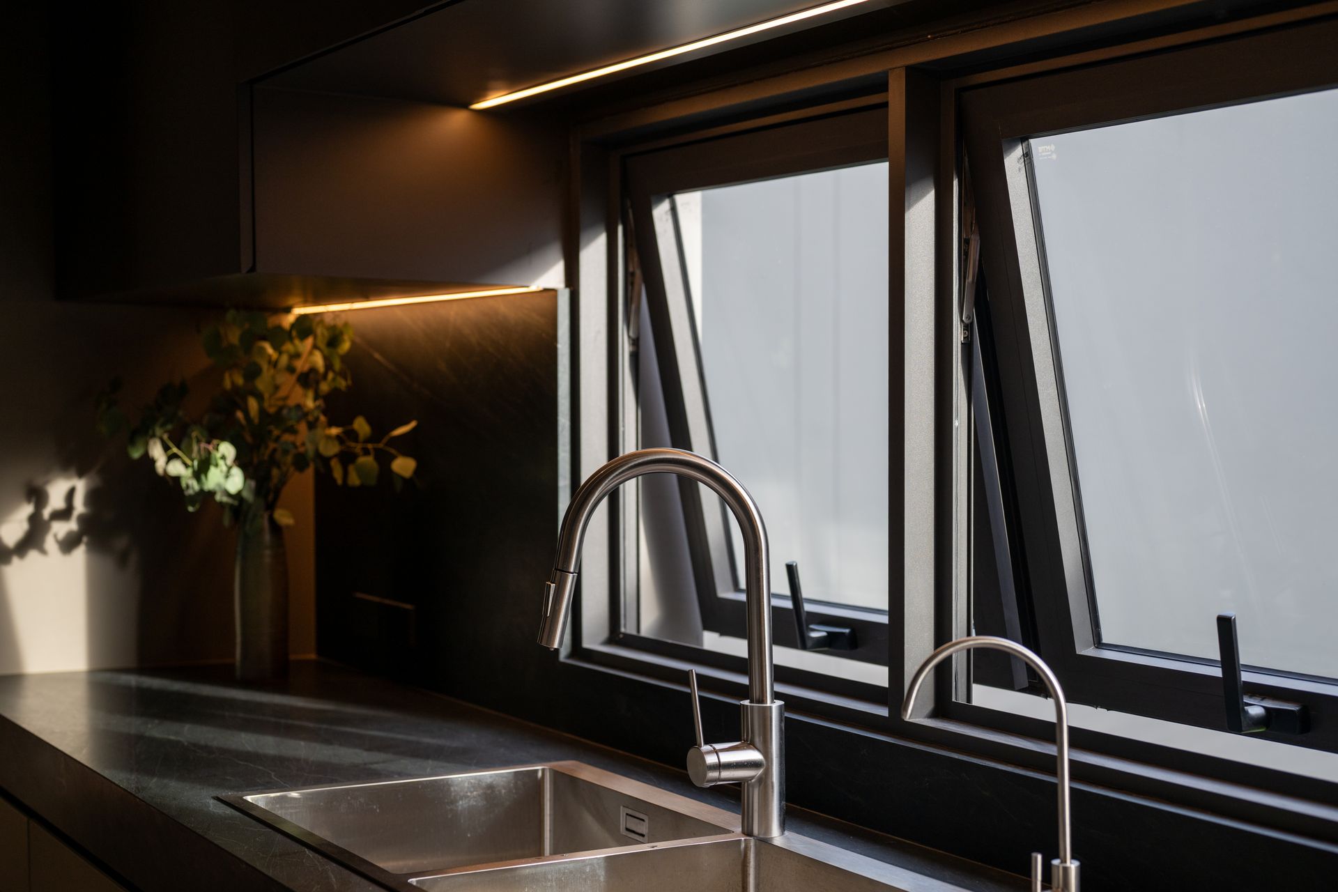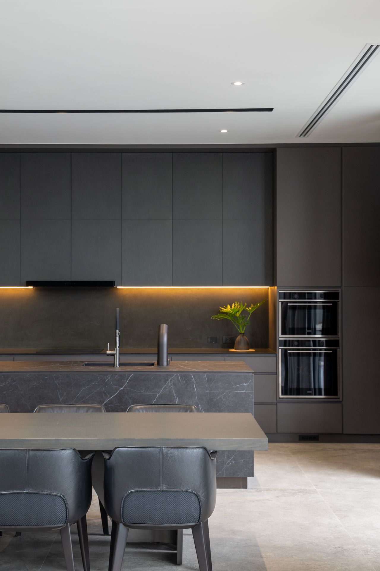 “ไร้ประกาย” ยังถูกสะท้อนผ่านการเลือกใช้วัสดุทุกชนิดในรูปแบบผิวด้าน (matte finish) ทั้งหมด ไม่ว่าจะเป็นพื้น ผนัง ฝ้า ไปจนถึงเฟอร์นิเจอร์ การลดทอนแสงสะท้อนทำให้บ้านดูสงบนิ่ง เรียบง่าย เน้นบรรยากาศความเป็นส่วนตัว